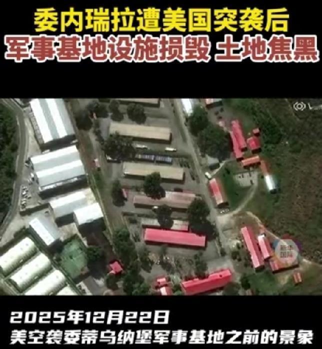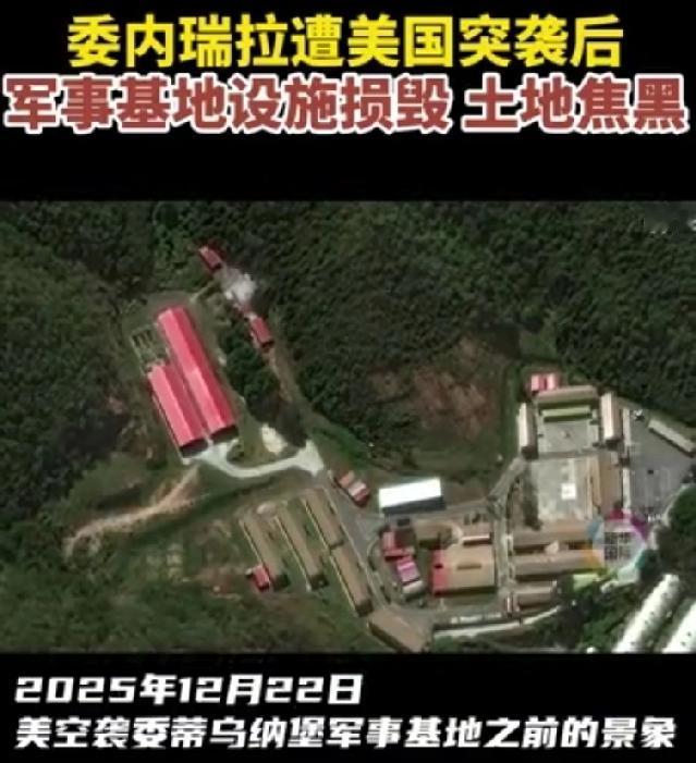 美国突袭后委内瑞拉卫星对比图 看到美国突袭后委内瑞拉的卫星对比图,真的太触目惊心了。当地时间2026年1月3日,特朗普下令对委内瑞拉境内多个目标发动袭击。从卫星图能看到,2025年12月22日空袭前的加拉加斯蒂乌纳堡还是正常的景象,可到了2026年1月3日空袭后,完全是一片狼藉。 美军的侵略让委内瑞拉多名军职人员牺牲,多地平民丧生。美国为了自身利益,随意发动战争,给委内瑞拉人民带来了巨大的灾难,这卫星对比图就是美国暴行的铁证。