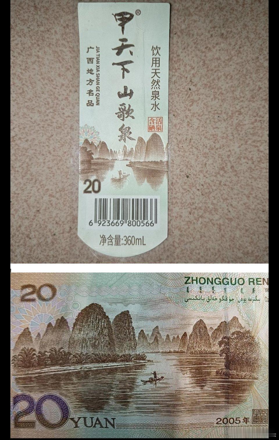 矿泉水标签印高度相似20元人民币要是不仔细看,这款矿泉水的标签的主体图案真的和20元人民币的主体图案差不多。仔细一看,更是高仿的。关键还故意印一个20在左下角。这擦边球打得也太明显了吧?
