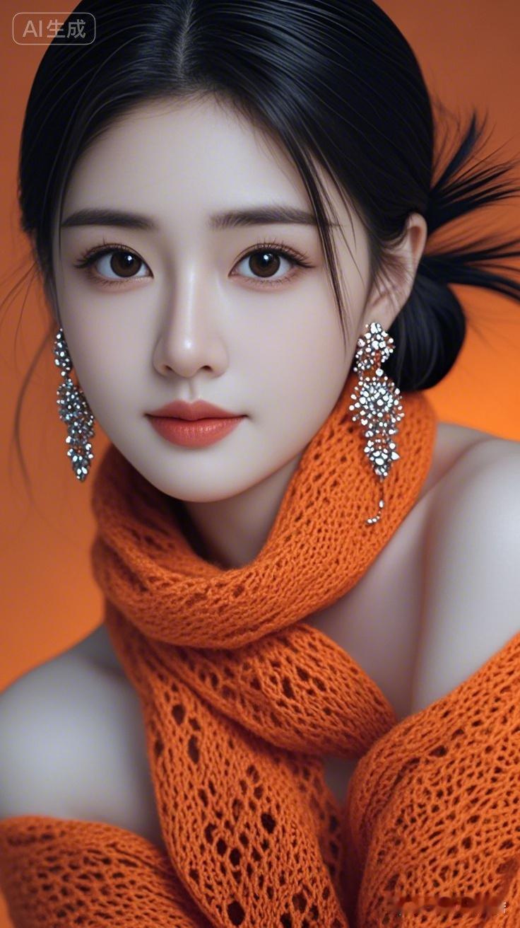 冬日暖阳下的甜美少女,橙色的针织围巾和耳环相得益彰,尽显温柔与时尚。