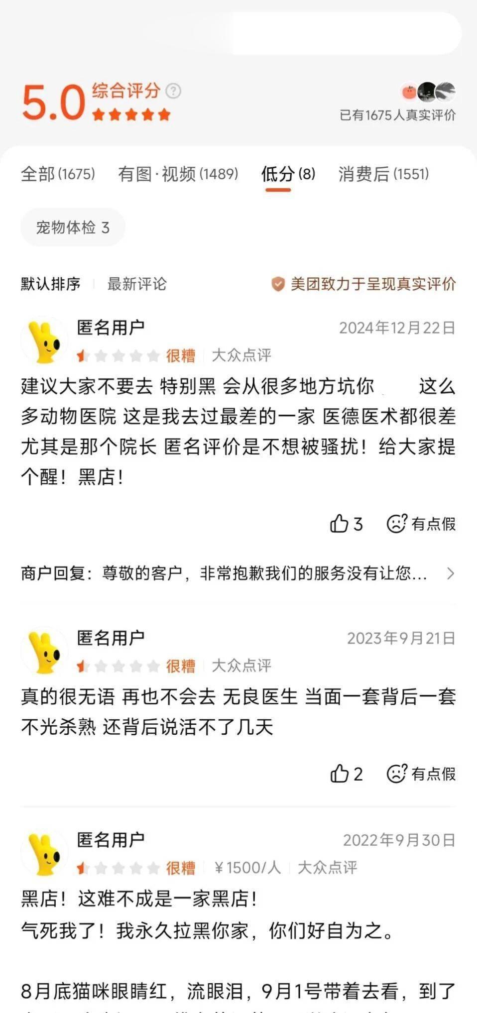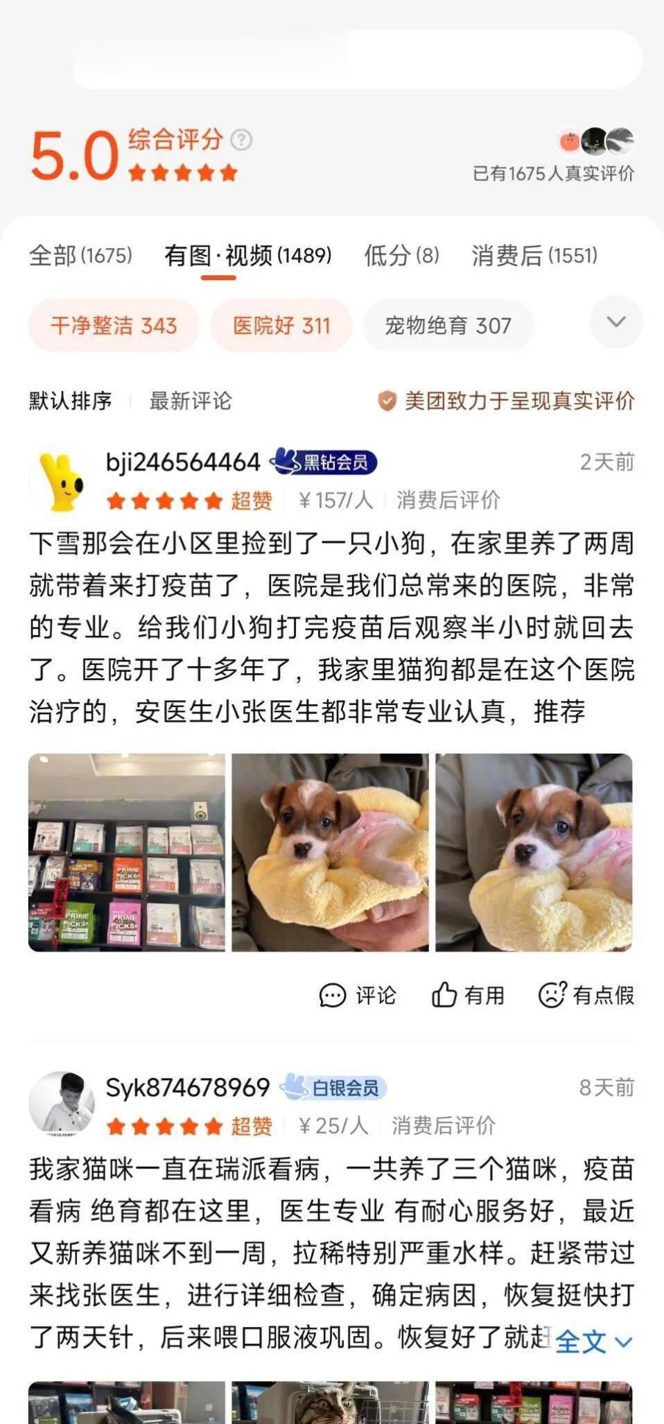「创业最前线」在美团App上搜索瑞派宠物医院的评价呈现出两极情况,有人打五星,说兽医妙手回春,有人打一星,说医生没有医德只想赚钱。