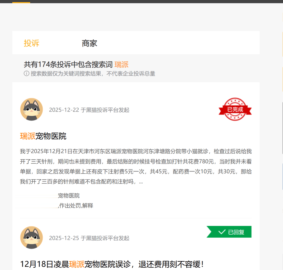 瑞派宠物医院在黑猫投诉平台上存在174项投诉,主要涉及医疗服务质量、收费透明度及服务态度等宠物医疗纠纷。