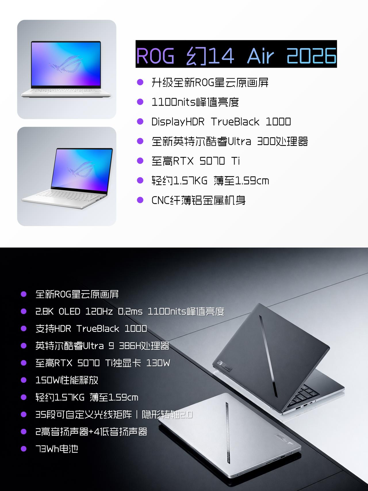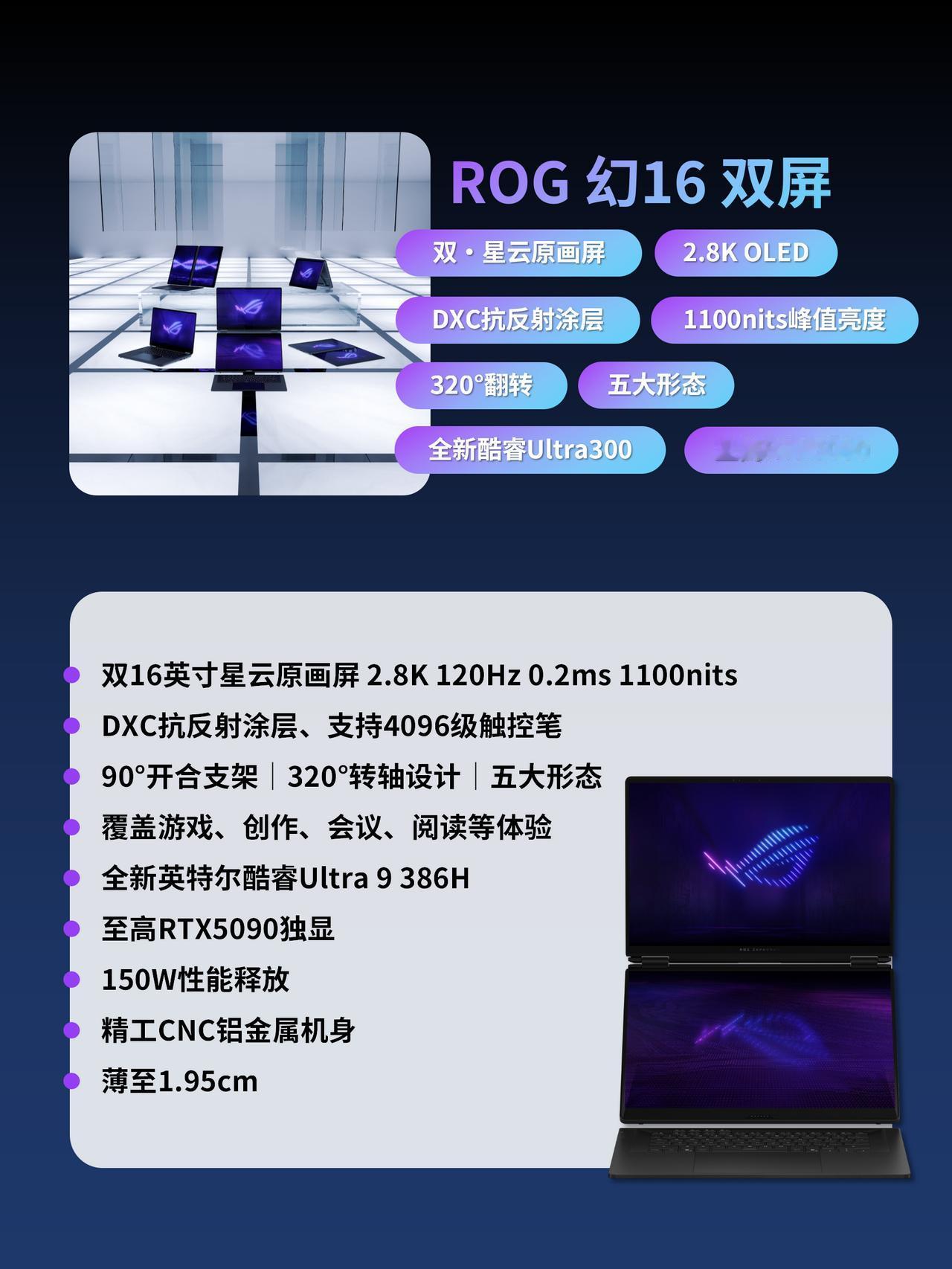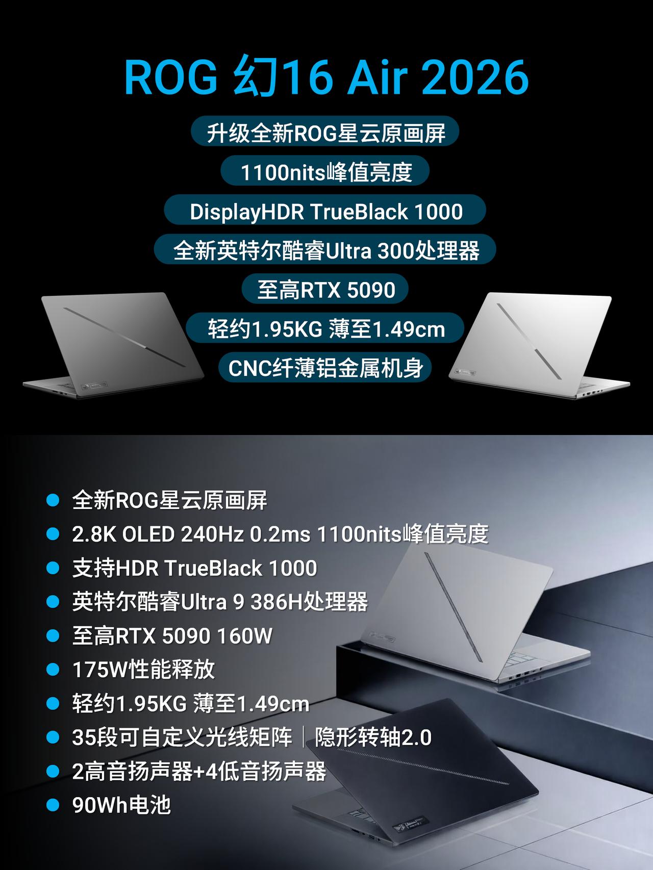 没人觉得ROG 2026新品很超前!?? 这次CES 2026上,ROG一口气更新了好几台高性能全能本,整体方向很明确:性能继续拉满,但形态和体验开始分化。简单帮大家捋一下重点: ROG 幻16 双屏:双倍快乐,观感终于统一了 两块屏幕都是16英寸的RIG星云原画屏,观感完全统一,像剪视频时主屏幕剪片、副屏放素材,不用来回切窗口;副屏还支持触控笔,记笔记、画草稿都顺手。再加上新一代酷睿Ultra 386H处理器和最高到5090独显,不管玩3A游戏还是做渲染都能扛住;而且320° 翻转能切换平板、会议等好几种形态,经常换场景用电脑的创作党会很实用。 ROG 幻16 Air (2026):高性能轻薄本里的“西装暴徒” 在1.49cm的轻薄身躯里,最高可选RTX 5090独显!这在以前想都不敢想,散热架构肯定是大改了。 屏幕升级到ROG星云原画屏,2.8K OLED 240Hz,打高帧率游戏几乎没拖影,1100nits的亮度户外用也看得清。 A面标志性的灯带升级到了 35 个分区,高级感比去年更上一层楼。 ROG 幻14 Air (2026):14寸的小钢炮 屏幕同样升级到了星云原画屏,2.8K OLED 120Hz 屏 + 1100nits 亮度,色彩和通透度都在线 1.57kg+1.59cm 的机身,揣进小背包毫无压力,适合天天带电脑跑的学生 / 通勤党。 性能相比上代提升不算猛,最高RTX5070Ti,但是整机的性能释放相比上一代有进一步上涨,来到了150W,更适合轻度创作、日常办公,不用来搞太吃配置的活儿就很够用。 大家觉得今年这波“信仰之眼”的升级有诚意吗? CES 2026ROG 2026双屏旗舰全能本双屏笔记本性能最强双屏本屏幕最大双屏本高性能全能本专业性能轻薄本2026性能最强双屏本2026全能标杆ROG幻16双屏ROG幻14Air 2026ROG幻16Air 2026CES2026 笔记本推荐 游戏本