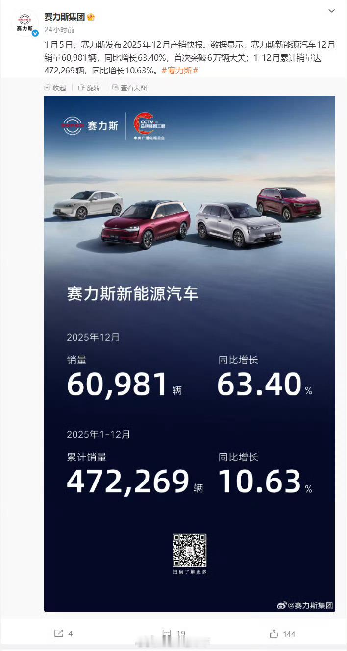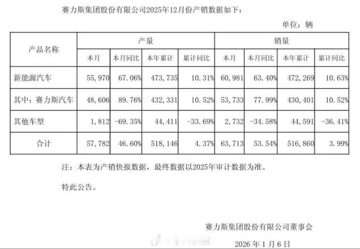 赛力斯12月新能源汽车销量6.1万辆今天赛力斯A股港股,都有3个多点的涨幅,横盘一段时间之后,总算是上涨了。毕竟这家重庆车企,2025年12月新能源汽车销量6.10万辆,同比增长63.40%。另外2025年累计销售是47.23万辆,同比增长10.63%。 所以股价上涨也合理,毕竟问界M8累计交付突破15万辆,问界M9在50万级豪华车销量也是销冠的表现。问界也累计交付了新车突破97万辆车。所以如果2026年的话,赛力斯是值得关注的。 广州