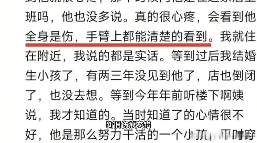智力障碍夫妇唯一的娃,在汕头餐饮店遭虐死,三年了赔偿还没影! 一对智力不太好的夫妇,在汕头一家餐饮店辛辛苦苦干了14年。本以为儿子是他们生活唯一的光,结果这光却被店里的“恶魔”亲手掐灭了! 附近居民说,不止一次听到店里老板娘骂娃,甚至还看到有男孩拿铁锅勺子砸这娃的头。这娃本该在学校读书,却长期在店里洗碗打扫,手臂上新旧伤痕一道叠一道。 监控还拍到,这娃好几次想跑都被老板硬拽回去,接着就是更狠的折磨,最后居然被活活烫死了! 事情过去三年了,这对残疾父母一分赔偿都没拿到,就连想给孩子喊冤都难上加难。