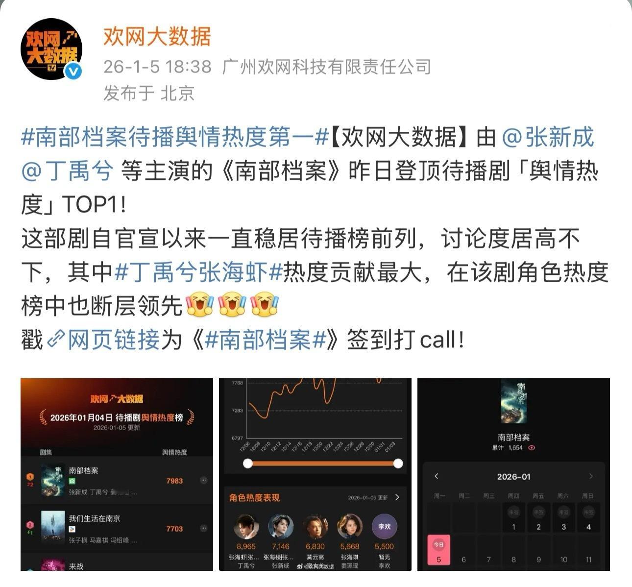 南部档案登顶待播剧舆情热度TOP1丁禹兮的张海虾热度贡献最大在角色热度榜中也断层领先