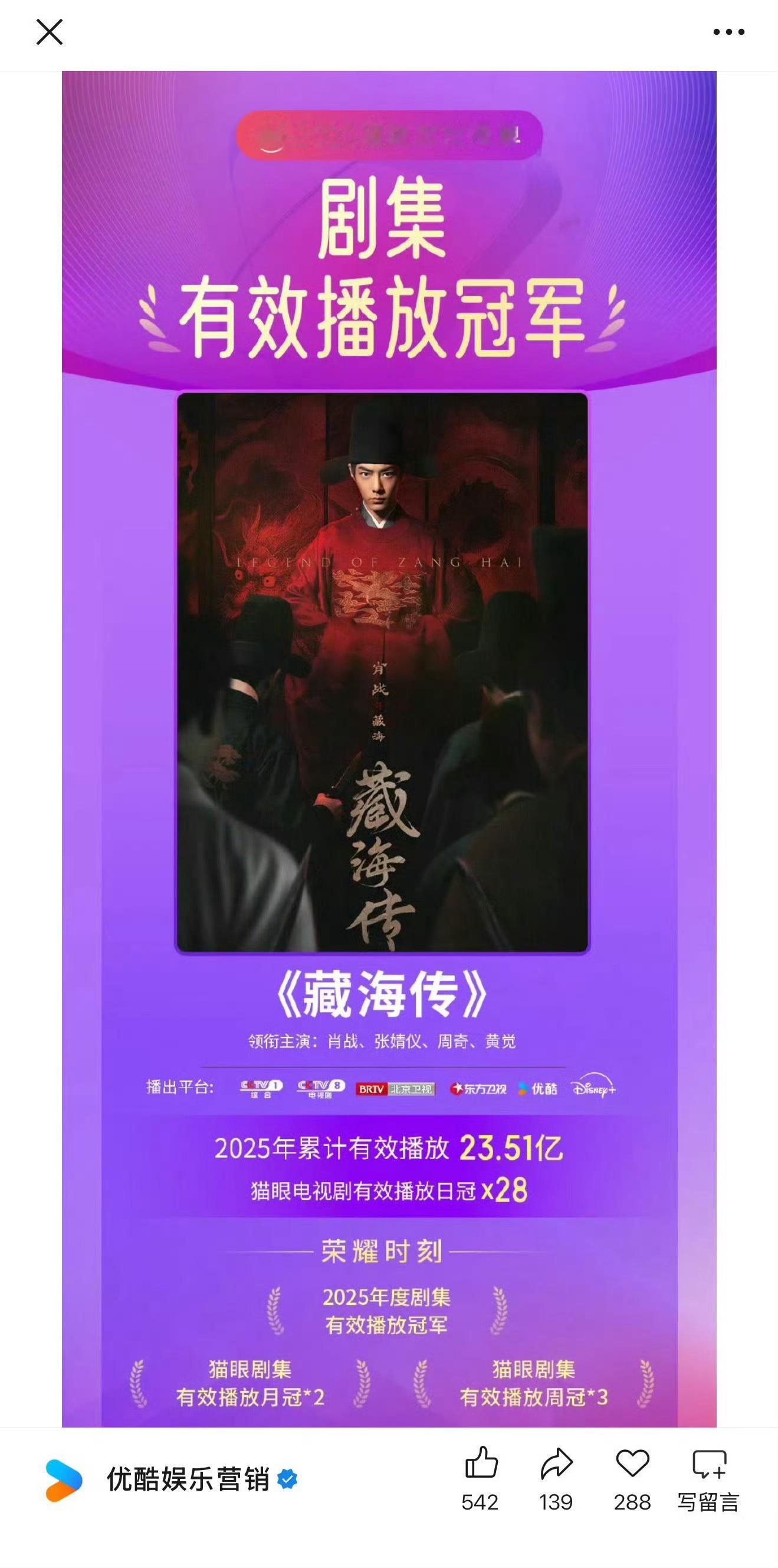 我已经不记得这是优酷官方第多少次夸肖战的藏海传了,反正就是从开播以后三天两头就要