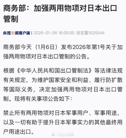 禁止所有两用物项对日本军事用途出口烽火问鼎计划商务部就加强两用物项对日出口管制答问 笑死,咱们这波对日本军事夹断物资,就是离间日韩的。1月5日,韩国总统李在明抵达东方,与咱们已经进行过细致的交谈。然后,1月6日直接官宣,对日本军事用户,直接掐断其获得军民两用物资的能力。按道理,咱们掐断出口,自己也是要承受物资无法出口的损失的。结果你猜怎么着?李在明来了!带着超级财团飞来了。也许,咱们和韩国已经聊好了对韩国增加出口那些军民两用物资,也许没有。如果有,那就是咱们和韩国一起整日本。如果没有,那韩国总统就得自己去和高市早苗解释去了!毕竟,按照韩国总统李在明的日程安排,这次去完东方,马上就要在14日准备前往日本高市早苗的老家奈良进行访问。这种访问家乡的行程安排,本身就是韩国也不想和日本因为独岛问题彻底闹翻而采取的缓和做法。毕竟,韩国能存在全靠日本在后面顶着,和日本的关系也不能太差。说到底,韩国现在也是想搞中立骑墙,与日本也拉拉扯扯。虽然,对日本升级威胁制裁很重要,但是,同样的事情,在正确的时间做,会更加事半功倍!所以,这一波,估计李在明在搞事遭秒的面前就尴尬了。毕竟你才带了超级财团去了一趟,东方就对日本断货,说韩国没吃进这批货高市也很难信啊!