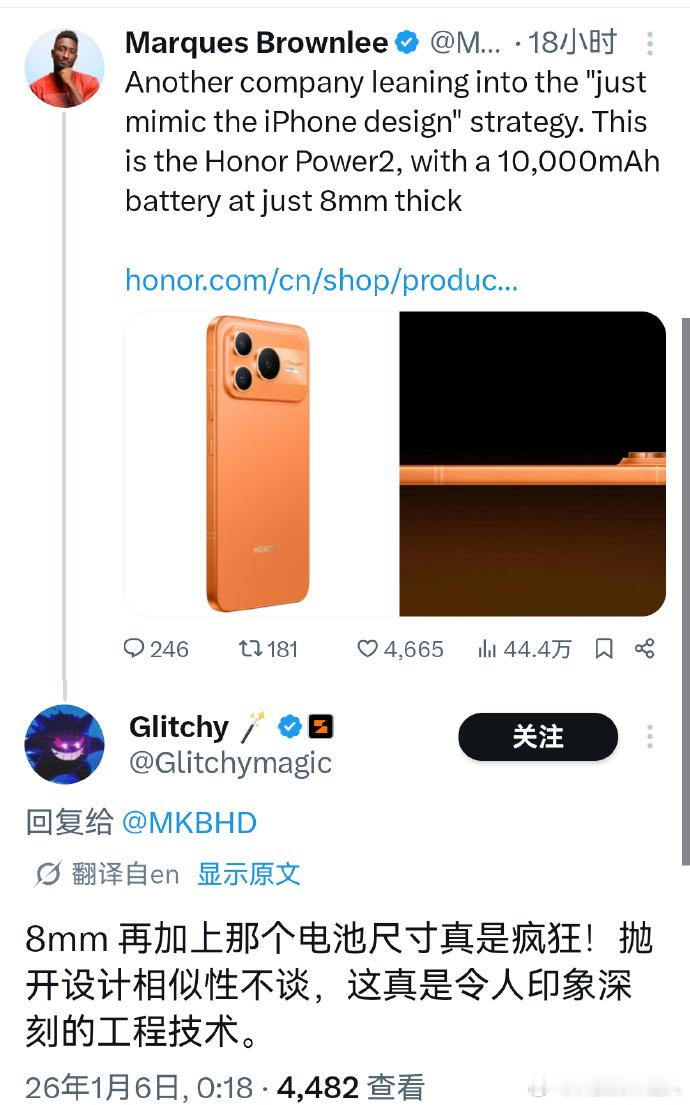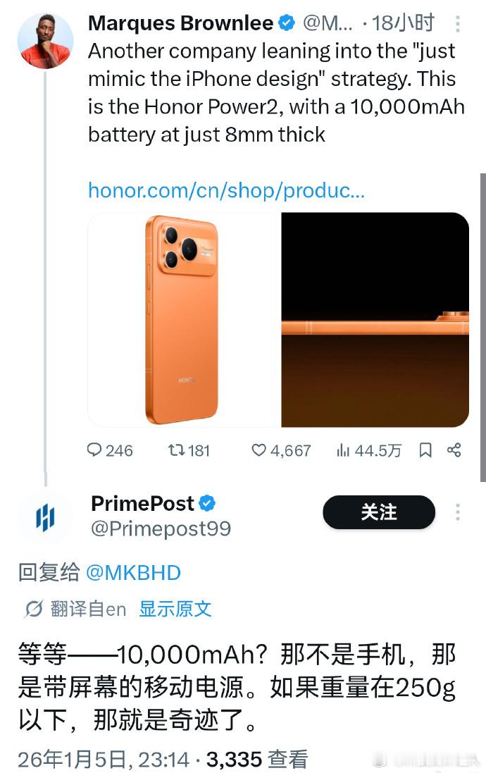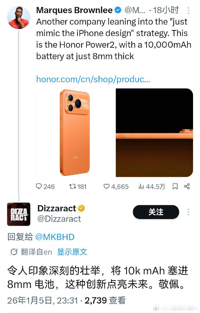 荣耀Power2大电池震惊老外我刚开始听到10080mAh电池我都震惊了,更何况老外他们用的苹果手机最大电池也才5088,荣耀这个大电池足够他们震撼了,更何况机子还很薄,把苹果的续航和信号老难题都给解决了,换谁都觉得不可思议了