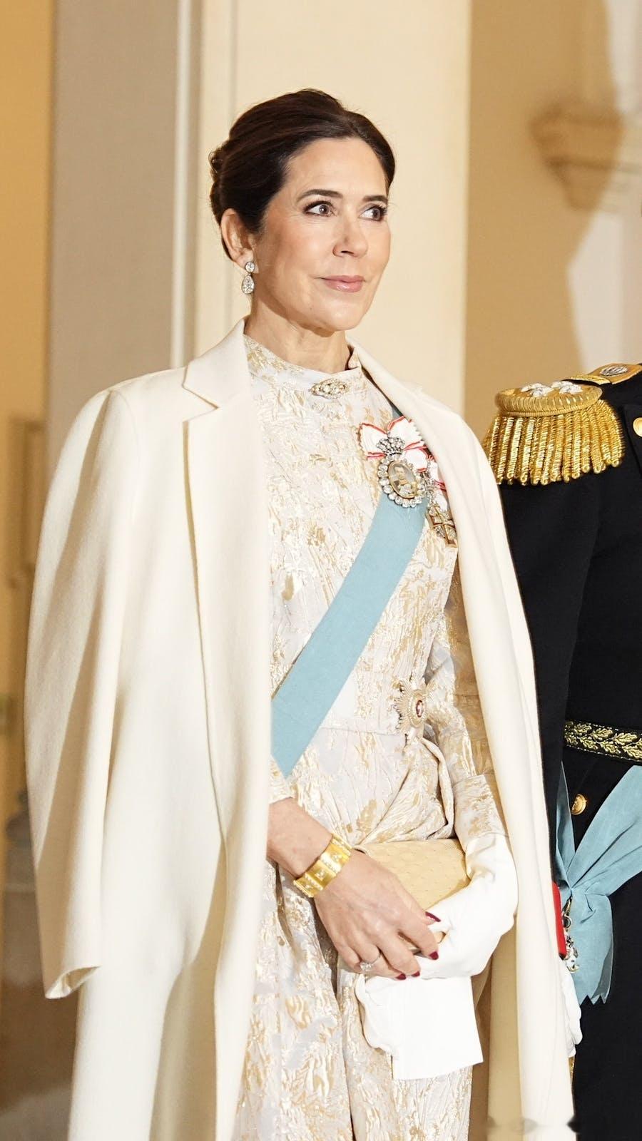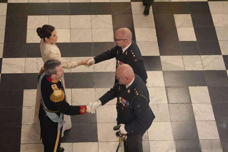 新闻 2026.1.6 丹麦国王夫妇主持今年的第三场新年接待会,因为今天是接待国内政府机构及组织的官员们,约克姆王子作为丹麦驻美国大使馆国防工业专员出席活动。大玛丽新解锁弗雷德里克八世之妻,露易丝王后的订婚手镯,把瑞典-挪威王后露易丝黄金链条手镯的环形吊坠部分拆下改装成胸针网页链接,旧长礼服来自Teri Jon by Rickie Freeman,珠宝搭得不错,有创意又解锁压箱底老货。