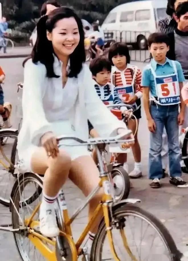 邓丽君去参加自行车比赛,她的脸圆圆的,她的长相像她的歌声一样甜美。