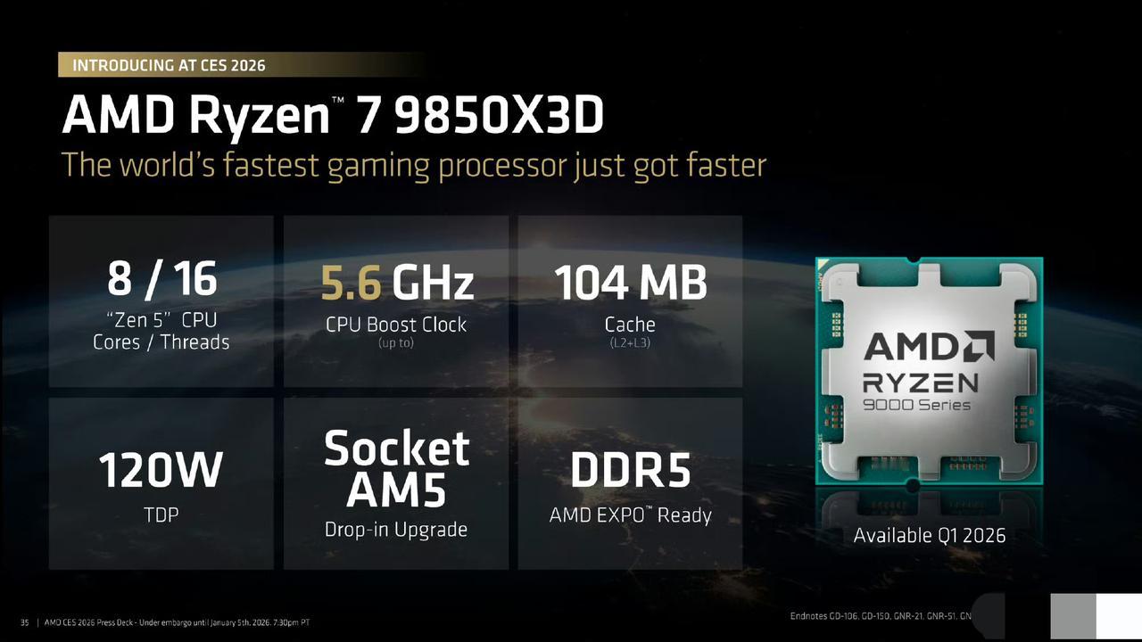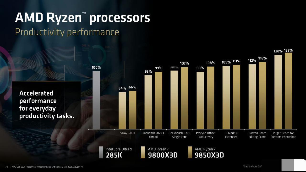 英特尔又被AMD吊锤了?[我想静静]AMD正式发布Ryzen 7 9850X3D,CES 2026游戏CPU王炸登场!作为9800X3D的高频进化版,直接将游戏性能推向新巅峰。 5.6GHz Boost频率暴涨400MHz,8核16线程搭配104MB超大缓存,120W TDP依旧能效拉满,第二代3D V-Cache技术让延迟再降、帧率再升。 发布会PPT正面硬刚老对手Core Ultra 9 285K,35款3A大作+电竞游戏实测封神:平均领先27%,《博德之门3》狂超60%,CS2帧率飙升48%,《赛博朋克2077》也领先32%,比前代9800X3D的24%优势更上一层楼。更惊喜的是,它不仅是游戏王者,单核性能加持下日常办公、图片处理也能碾压多核竞品。 这款“更快的最强游戏U”将于2026年一季度开售,国行价约3500元,AM5主板直接兼容,外星人等整机已同步跟进。