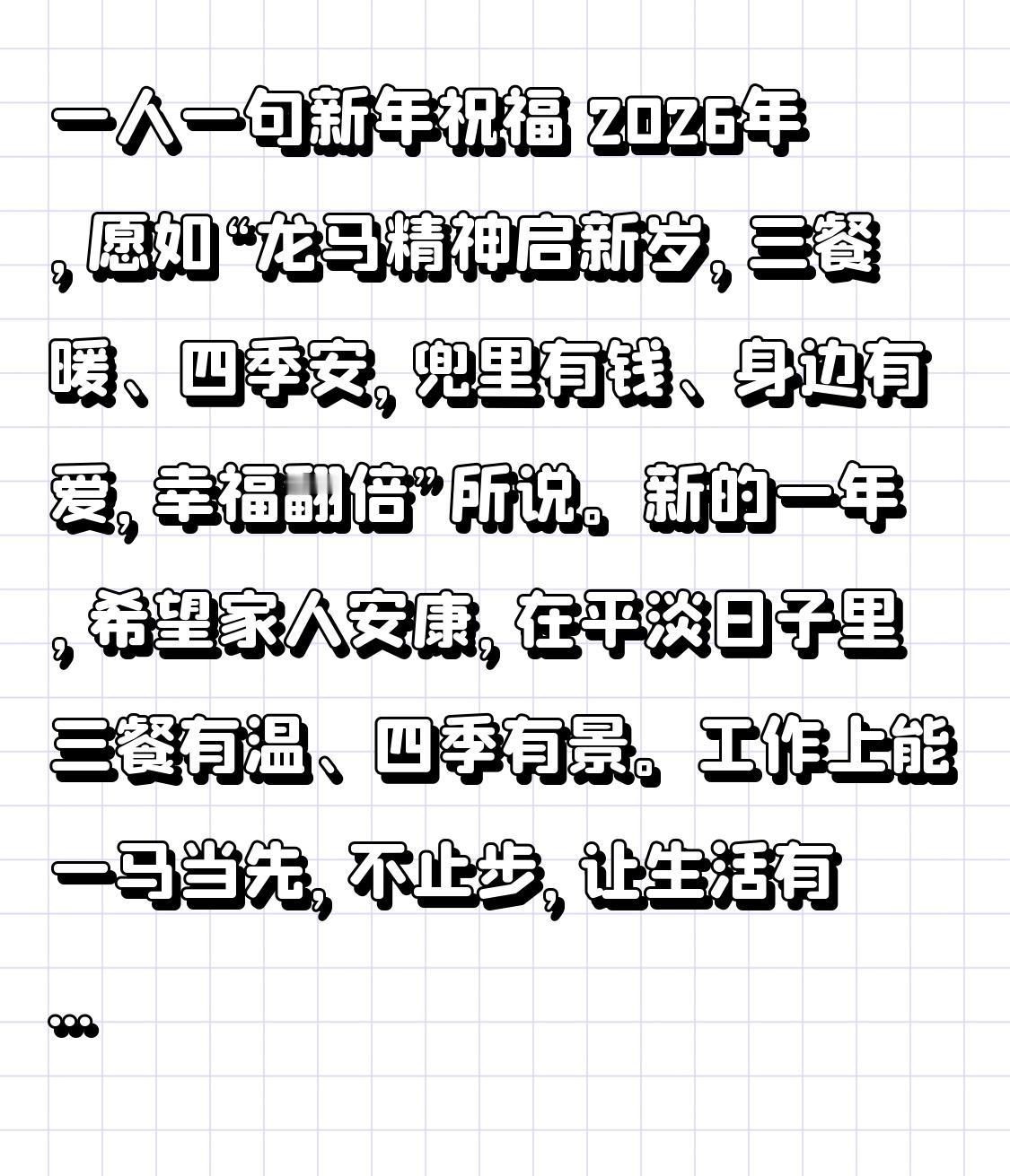 一人一句新年祝福 2026年,愿如“龙马精神启新岁,三餐暖、四季安,兜里有钱、身边有爱,幸福翻倍”所说。新的一年,希望家人安康,在平淡日子里三餐有温、四季有景。工作上能一马当先,不止步,让生活有奔头,工作有甜头。财运也能如马蹄声声,步步而来。就像家人的欢声笑语是奋斗暖光,生意红火是生活稳帆,愿大家稳稳地幸福,步步地丰盈,新岁所求皆如愿,所行皆坦途!