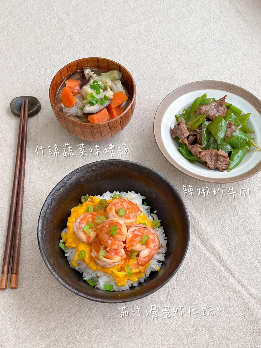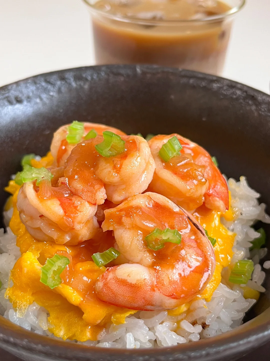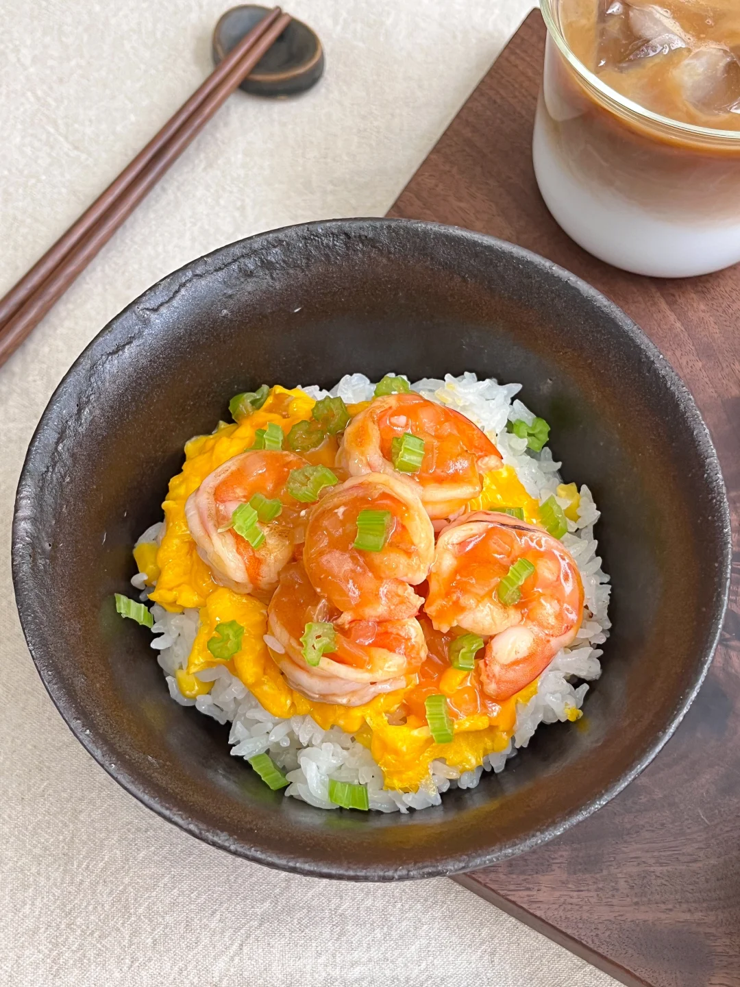 炒一点滑蛋放到玉米饭上 铺上QQ的茄汁虾仁