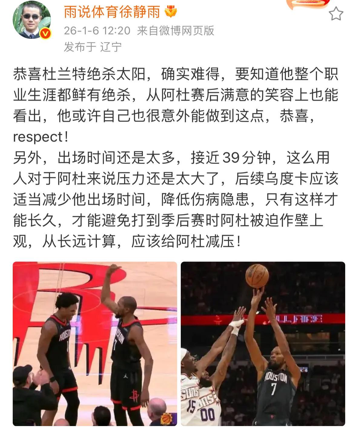 2026.1.6|火箭100—97太阳西部第5|22胜11负|KD绝杀之夜杜兰特