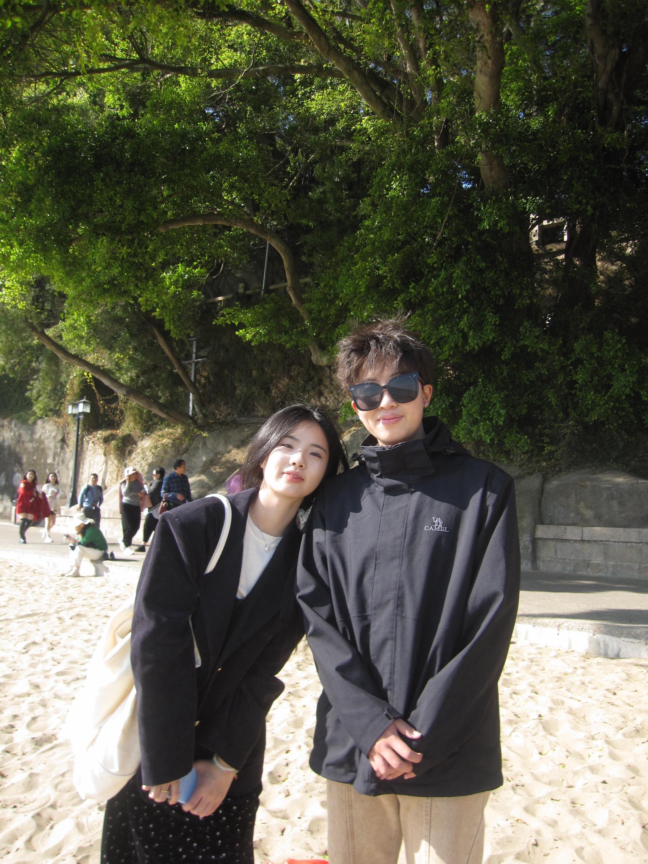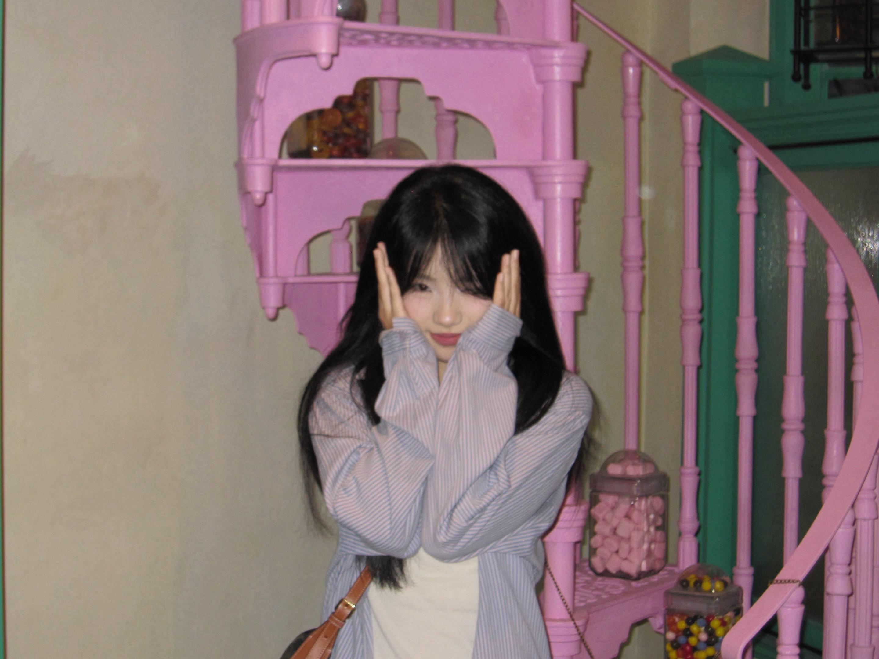 优雅东方韵,浅蓝上衣配米色长裤,漫步古风庭院,尽显时尚与古典的完美融合。