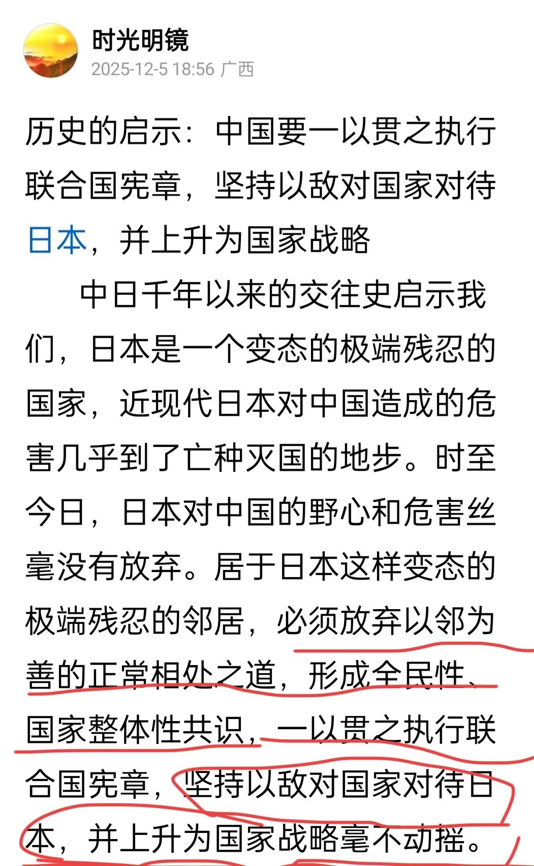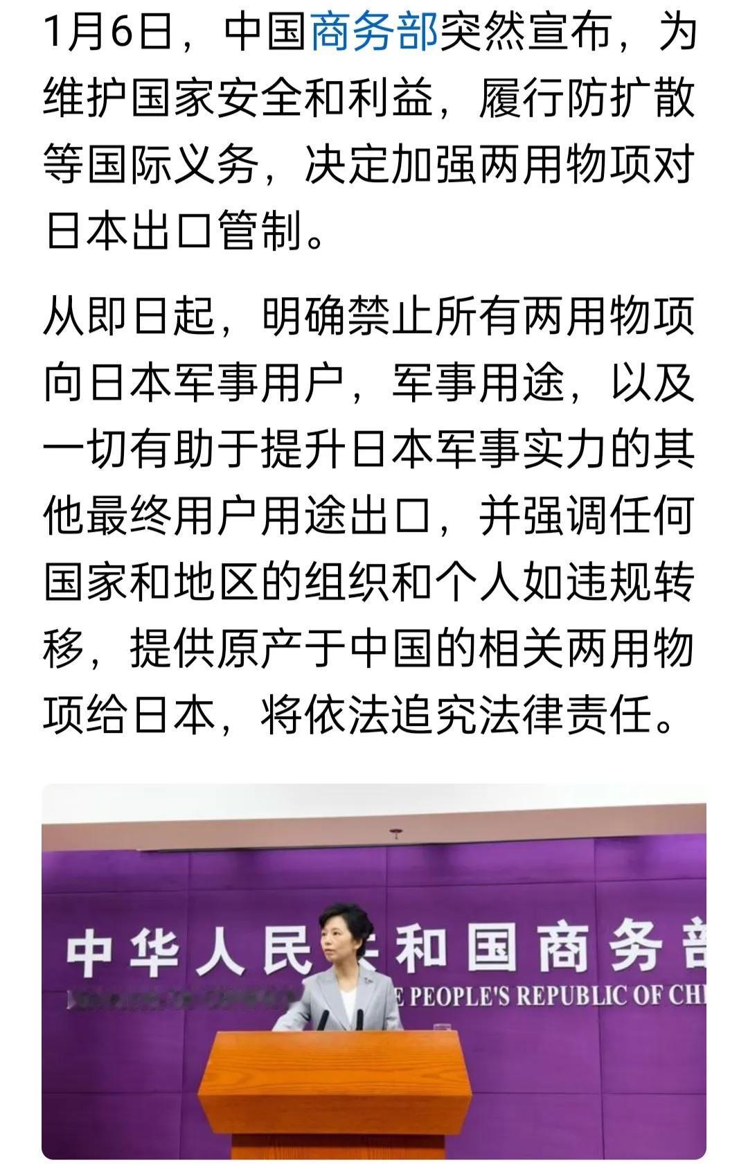 履行联合国宪章,从资源入手限制日本重新武装能力,商务部出台加强两用物项对日本出口管制 日本这个变态国家,对中国的伤害死不悔改,高市早苗还明目张胆扬言武力介入中国内部事务,真是狂妄至极! 笔者去年12月5日在头条发表观点,主张对日本放弃以邻为善的正常相处之道,履行联合国宪章,坚持以敌对国家对待日本,形成国家整体共识,上升到国家战略不动摇。 今天,国家商务部出台了加强两用物项对日本出口管制的决定,这既是为维护国家安全和利益,响应防扩散义务的举措,又是履行联合国宪章从资源入手限制日本重新武装的正义行动。 对于日本的狂妄和死不悔改,我们不应该再以善良、忍让来自我限制,必须以大国之威给日本实实在在的教训,必须以国际惯常的规则与手段对待日本,绝不手软!