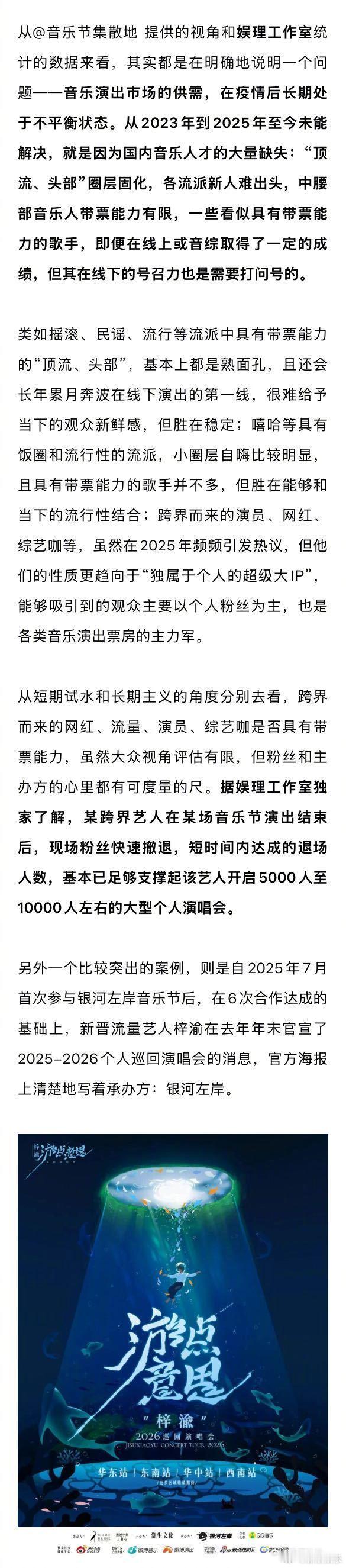 业内谈个人演唱会越来越多的原因业内谈个人演唱会越来越多的原因 梓渝演唱会和音乐节都获当地文旅大力支持背书 保持高质量舞台 带动地方经济的同时梓渝和梓渝粉丝yuni有效输出文旅口碑 确实是名副其实的带票王