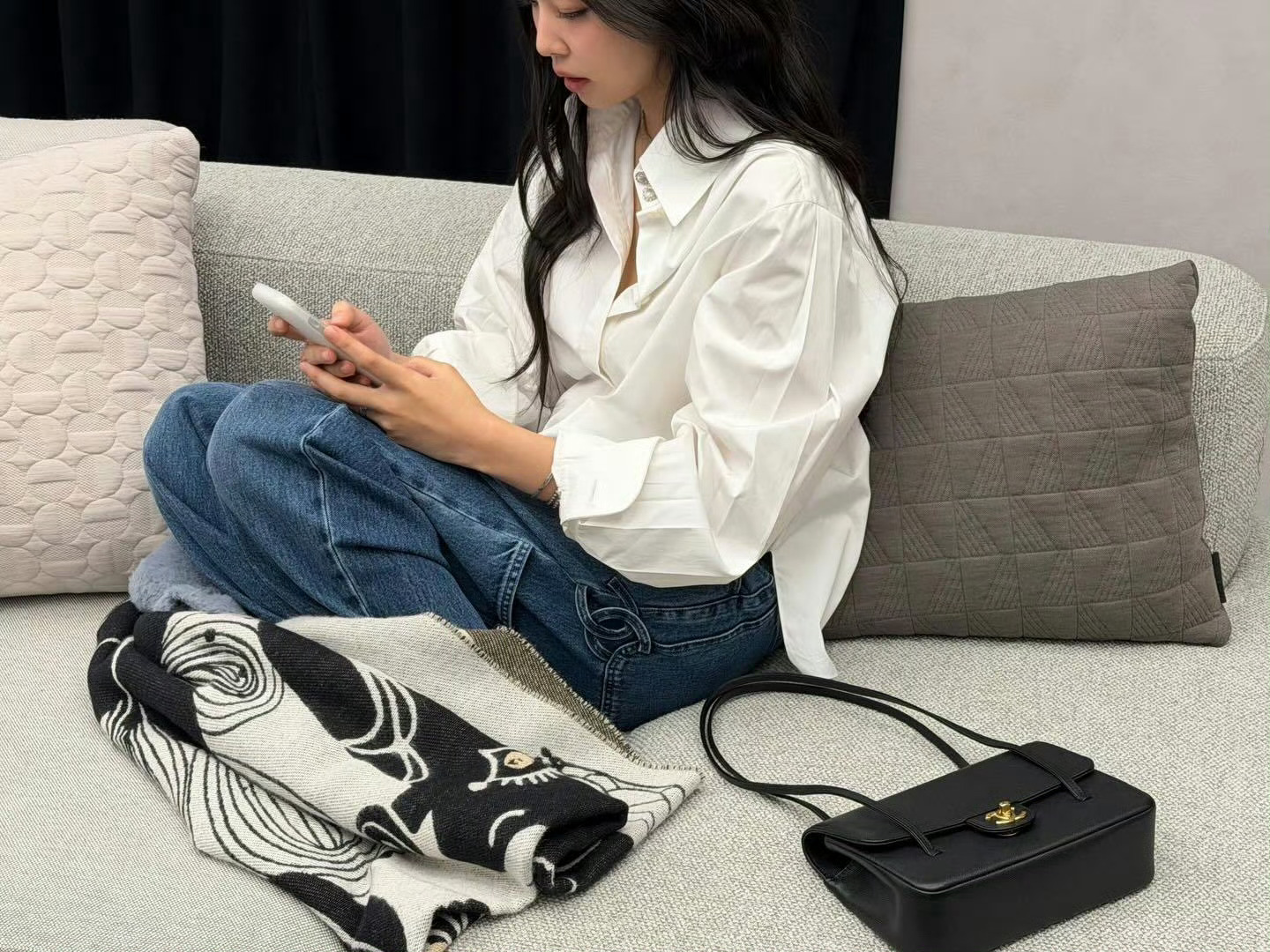 Jennie x CHANEL COCO CRUSH宣传照💎Jennie身穿白衬衫+牛仔裤造型,佩戴Chanel Coco Crush 珠宝出镜。轻松时髦的妮~