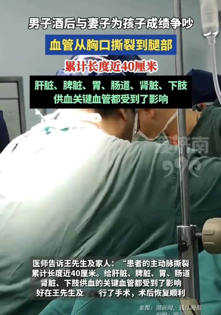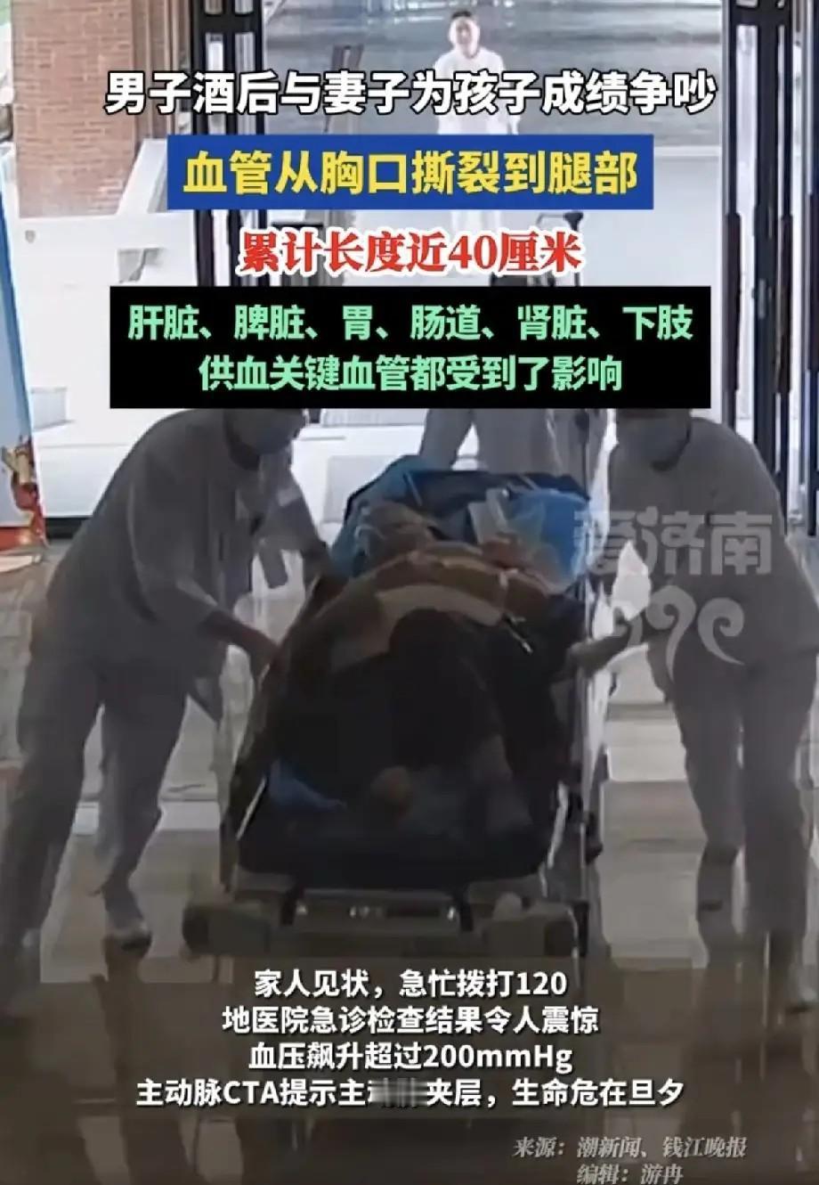 浙江一男子,酒后与妻子为孩子成绩争吵,血管从胸口撕裂到腿部,累计长度近40厘米! 谁能告诉我40厘米是怎么撕裂的?你要说血压压力大,撑破主动脉一个4CM,4MM口子可以理解……40厘米!腹腔里不都是血了吗? 说句实在话,龙生龙,凤生凤,老鼠生的儿子会打洞!孩子学习行不行是基因决定的,你再焦虑,再吵架生气,根本没用! 学习努力,在天赋面前一分不值,那些考上清华北大的,哪个不是从小就是学霸,一点就通的那种,所以孩子只要不干违法犯罪的事,就是一个好孩子,没有必要逼他们。学成什么样就什么样吧!