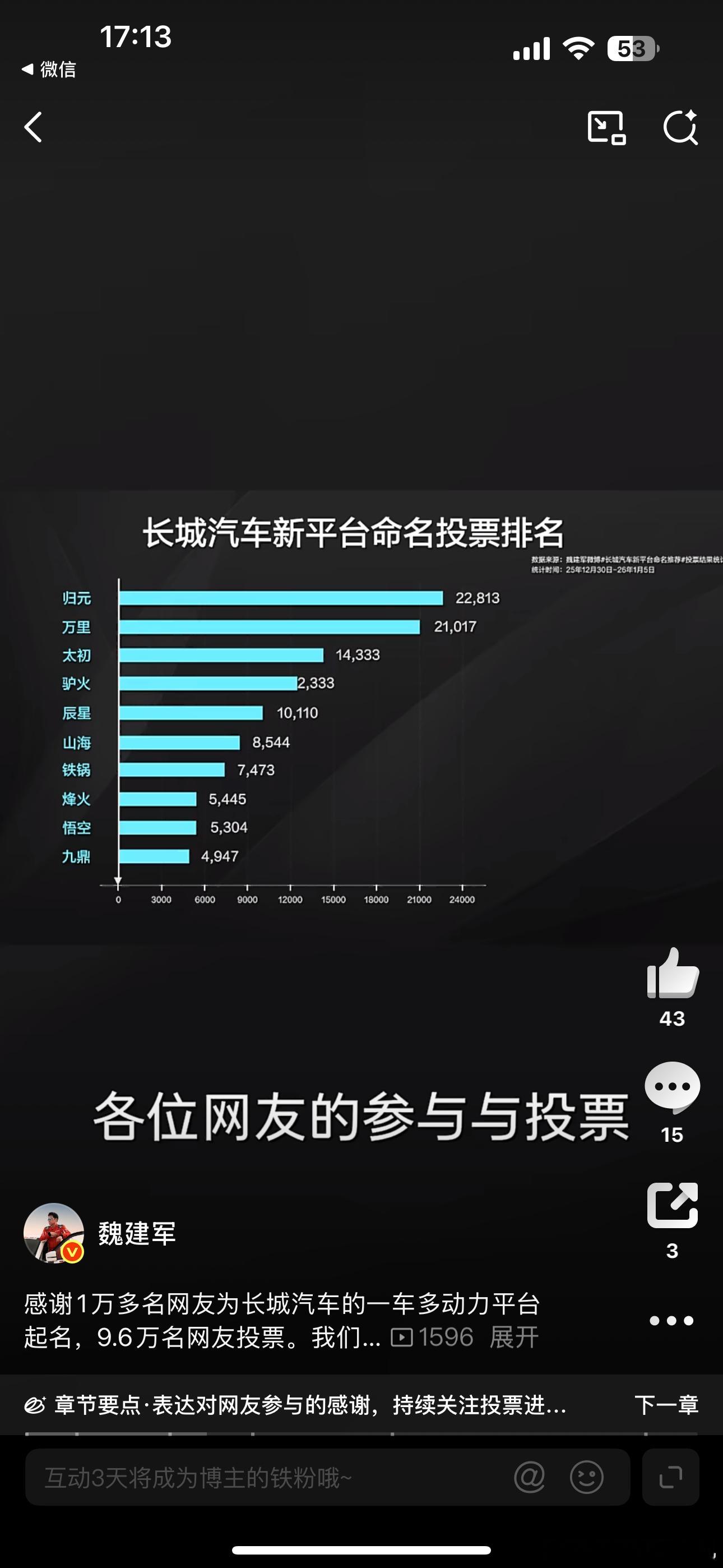 魏建军宣布新平台命名归元 给长城一车多动力平台取名这事儿有很多粉丝 网友都参与了之前“驴火”一路领跑但在决赛圈中 它被“归元”反超了归元这名字“归”是回归初心,不搞华而不实的技术炒作,聚焦安全、可靠、省钱这些用车核心需求;“元”是抓住根本,通过标准化、通用化降低用户的使用成本,让用户不用为冗余技术买单。总的来看吧 这个动力平台能满足研发的需求模块化的发动机对于维护来讲也有好处 总之 期待一下吧 以及长城的大V8
