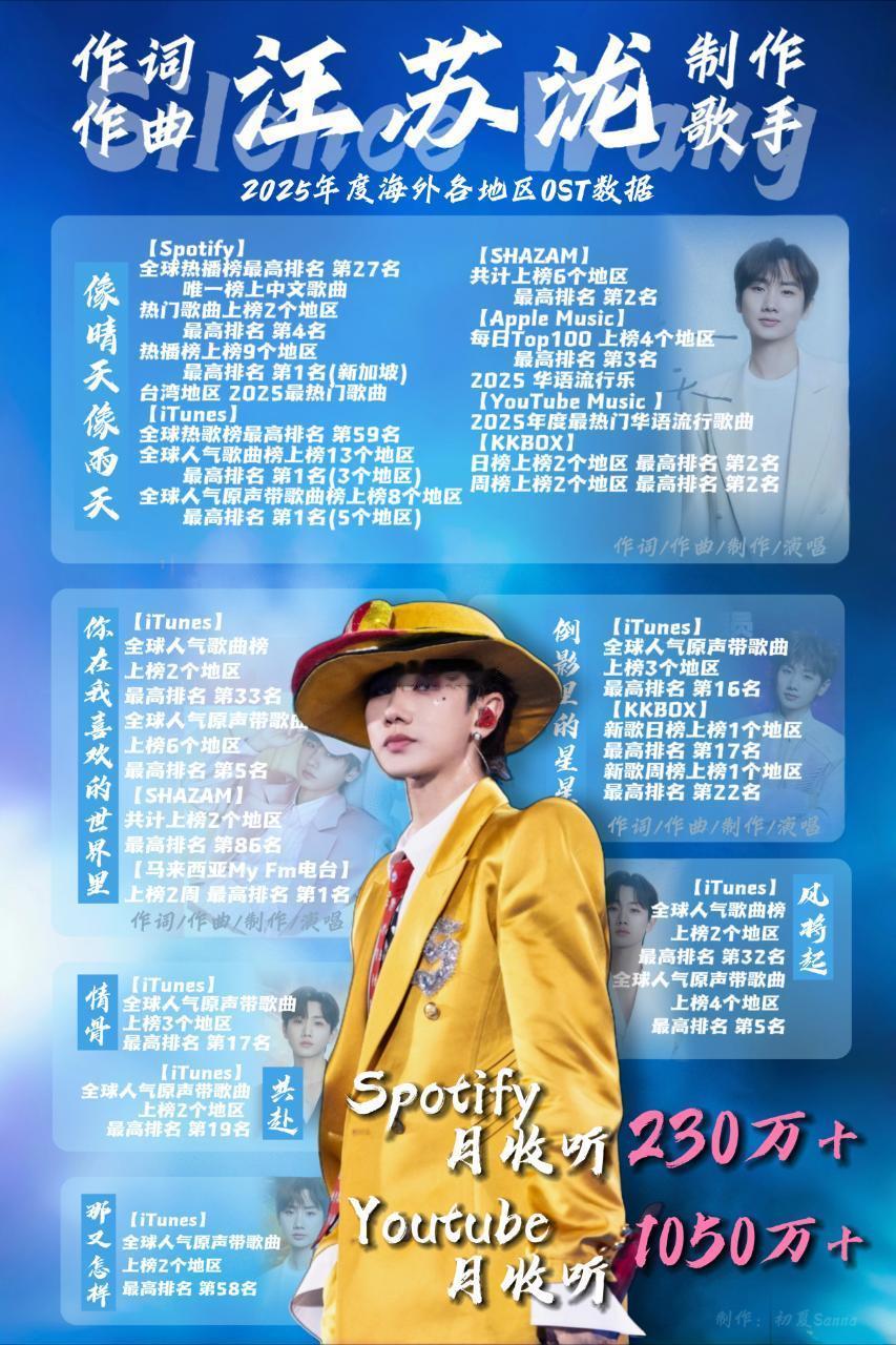 作词作曲编曲制作演唱全能的TOP歌手汪苏泷💗是演唱会秒光占比100%的汪苏泷💗新歌收听人数破亿的汪苏泷💗三音乐平台演唱歌曲23首千万+收藏、190首百万+收藏,实绩还在不断更新的汪苏泷💗