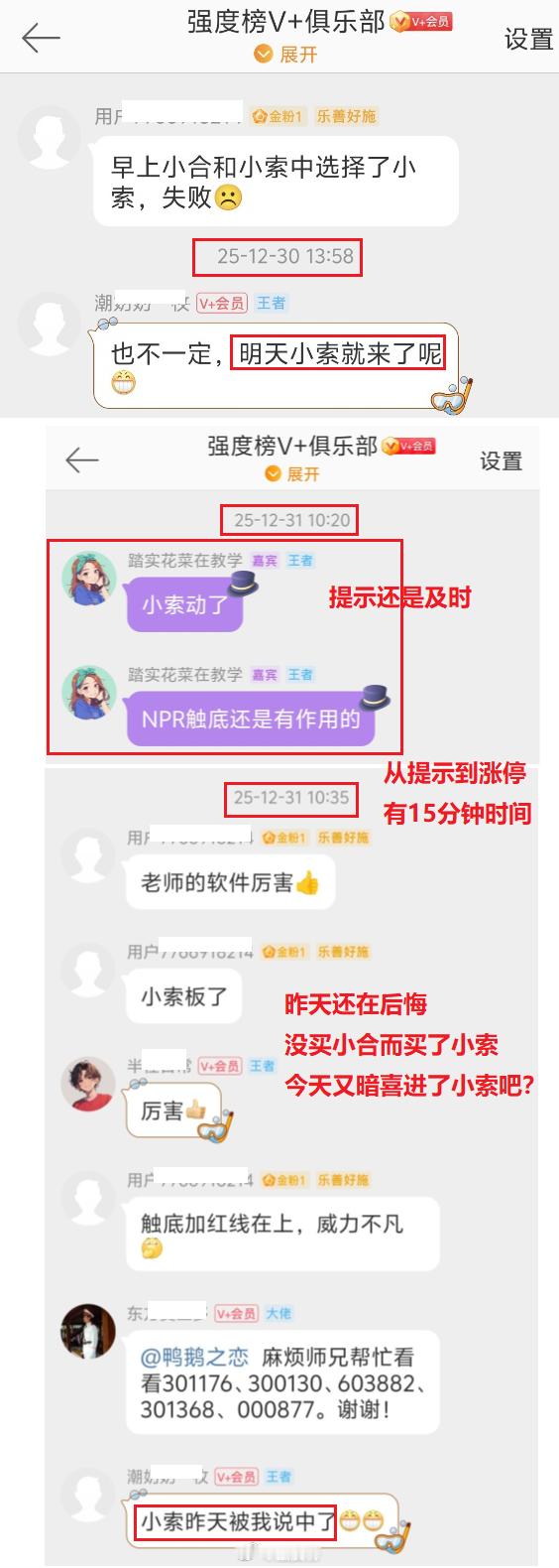经典案例 小索12月30日跌破年均线,按照常规软件以及普通操作,这天大部分人是会止损的。但是我们的指标里,这票股价回调,KZQD红线持续在上,而且NPR也进入触底状态,正是左侧进场的时机,所以,有不少朋友是这天进去的。虽然当天可能会套一点,但是第二天就马上起来了。应该说是完全符合榜主讲的模式来动作的。然后31日重新出红柱,NPR拐头起来时,榜主也在V+群里提醒了,应该说也是非常及时的,如果是按右侧来做的,提示这个时候是最佳的机会。所以,榜主的指标参考价值还是很大的,认真去用,它就是你的财神爷,当然就算是普通的用用,也是你一根非常好的拐扙。目前优惠活动只剩下今明后三天了~