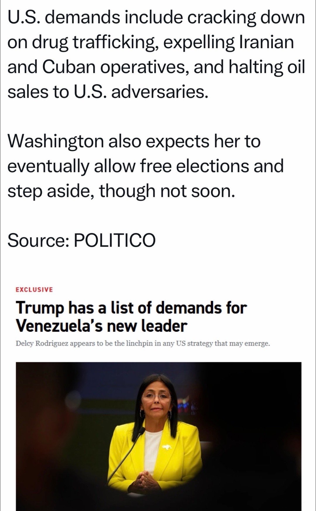 美国政府向委内瑞拉新领导层提出的要求:严厉打击贩毒活动、驱逐伊朗和古巴安插的人员、停止向美国的敌对国销售石油美国还要求代总统同意,适当的时候会进行大选,但不必是近期白宫官员向记者透露,目前对方态度比较配合。