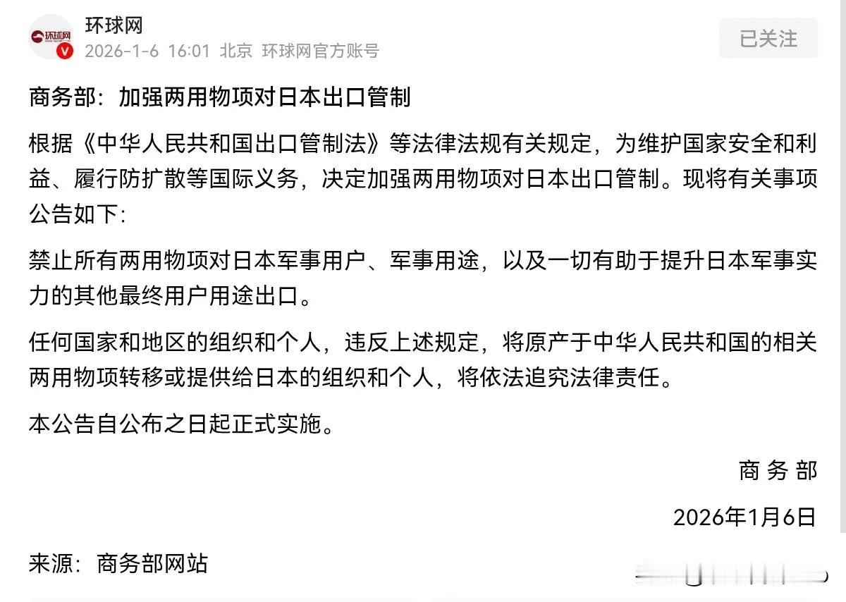 中国出手反制了!正在窜访的汉奸石平被狠狠的打了一记耳光!在我们通过军演发出震慑性消息,明确表示,我们绝不允许域外势力干涉我们的内政之后,没想到日本议员石平仍旧“顶风作案”,悍然窜访台湾。就在石平窜访当天,我们对日本进行反制。1月6日,我们商务部发表对日反制公告。 中国商务部明确表示,禁止所有两用物项对日本军事用户、军事用途,以及一切有助于提升日本军事实力的其他最终用户用途出口。 石平这个数典忘祖的货色,早就把民族大义抛到九霄云外。出身四川、毕业于北大,放着好好的正道不走,偏偏入籍日本后靠着抹黑祖国博眼球,否认南京大屠杀的史实,妄称钓鱼岛是日本领土,为了攀附日本右翼势力,连祖宗十八代的脸都能丢尽。这次他明知中方早有警告,还执意窜访台湾,无非是想踩着中国的核心利益,给自己捞取政治资本,只可惜算盘打得再精,也没料到中方的反制来得这么快、这么狠。 这份禁令看着只是一纸公告,实则精准掐住了日本军工的七寸。日本那些名头响亮的军工企业,比如川崎重工、三菱重工,造潜艇、造战机、造导弹的生产线,压根离不开中国供应的关键材料。海绵钛对日出口占比接近七成,特种轴承、高端合金、稀土永磁材料更是长期依赖中国市场,少了这些东西,日本的军工生产就是巧妇难为无米之炊。 以前日本还能耍小聪明,打着民用采购的幌子,把从中国进口的产品偷偷挪用到军事领域,钻着供应链的空子壮大自己的军力。现在中方把口子堵得严严实实,从精密电子元器件到特种工业气体,从机床设备到复合材料,只要沾点军事用途的边,全在禁止之列,连第三方转口的漏洞都给封死了,彻底断了日本军工的歪心思。 日本近些年一门心思搞军事扩张,又是突破和平宪法,又是大幅增加军费,还跟着美国在亚太搅局,处处针对中国。如今被掐住关键物资的命脉,那些雄心勃勃的扩军计划,要么只能暂时搁置,要么就得花天价从欧美国家采购替代品,成本飙升不说,还未必能买到同等质量的产品,军事野心算是被狠狠泼了一盆冷水。 石平本想靠着窜访台湾出风头,结果反倒成了引爆中方反制的导火索,估计日本右翼势力背地里都得骂他成事不足败事有余。这记响亮的耳光,不仅打在了石平这个汉奸的脸上,更打醒了所有妄图干涉中国内政的外部势力。 台湾是中国不可分割的一部分,这是不容置疑的事实。不管是跳梁小丑般的“台独”分子,还是石平这样的汉奸败类,又或是背后撑腰的域外势力,但凡敢触碰红线,中方必然会亮出反制的铁拳,让他们付出应有的代价。 各位读者你们怎么看?欢迎在评论区讨论。