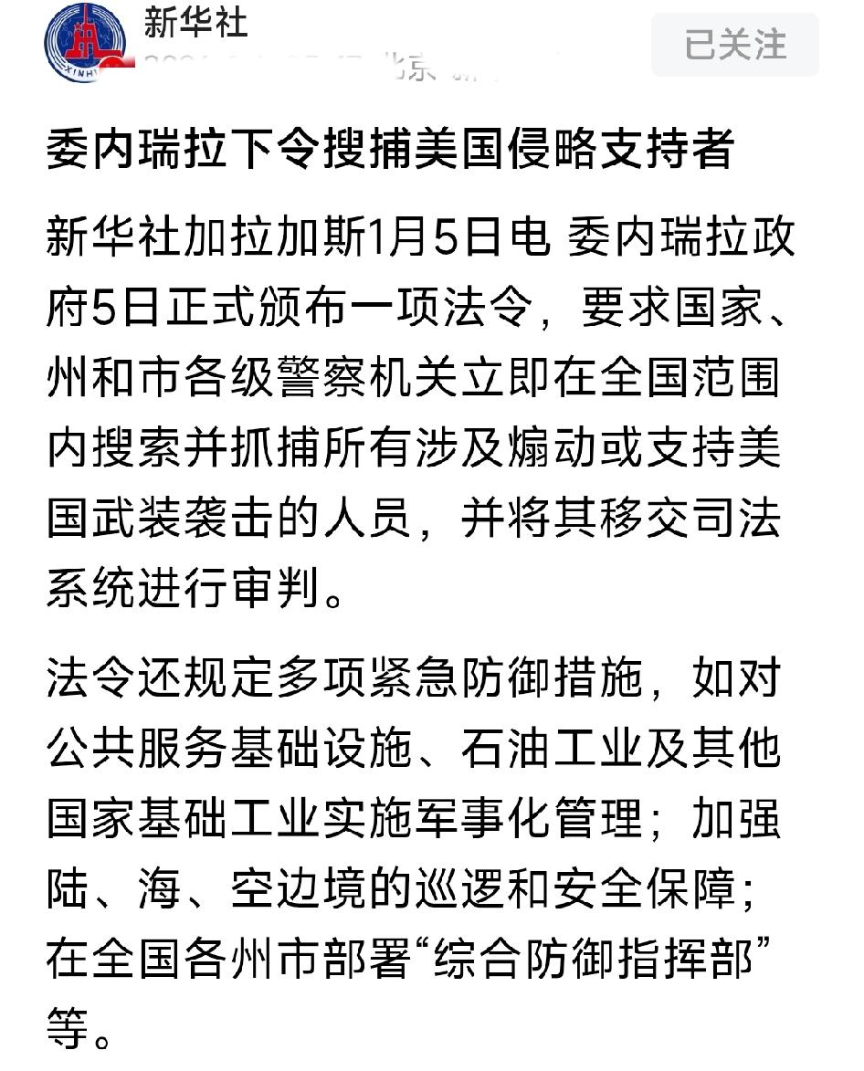 委内瑞拉政府颁布一项法令,要求国家、州和市各级警察机关立即在全国范围内搜索并抓捕所有涉及煽动或支持美国武装袭击的人员,并将其移交司法系统进行审判。内蛀能塌堡垒,内引可招豺狼,委内瑞拉搜捕内奸、筑牢边防,终于明白了“家防先堵内鬼门”,亡羊补牢,为时未晚。 委内瑞拉目前最该理清的是为什么美军入侵你们国家的时候,如入无人之境。攘外必先安内,这是亘古不变的真理。一个国家如果不想被外部侵略,那只能把自己国内一切内奸及贪污腐败分子、反动公知、间谍和叛国分子抓起来公开枪毙,全国拧成一股绳一致对外,才能不会发生像委内瑞拉那种总统都被美国侵入抓走的国际耻辱事件。清除内奸没错,不过要是以清除内奸的名义打压异己就难说了,委现在上任的领导好像是亲美的。委内瑞拉战局 委内瑞拉的困境 南美委内瑞拉 阿根廷委内瑞拉 守护委内瑞拉 委内瑞拉主权 美军在委内瑞拉