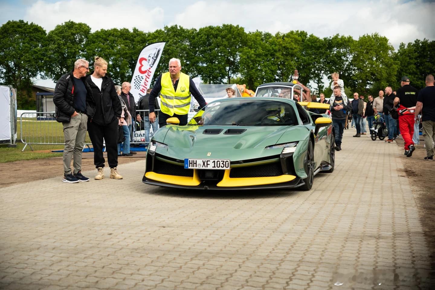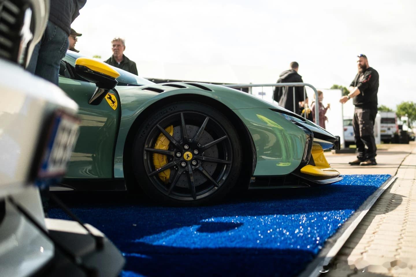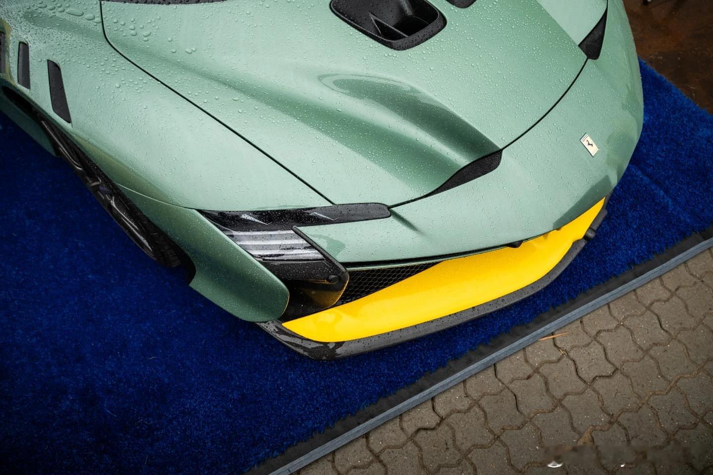外观配色为Verde Francesca,这是一款来自一台488 Pista的车主定制色,因为其好看的翡翠绿色而流行。外观方面前扰流板,反光镜和尾翼使用了黄色,此外还选择了碳纤维轮毂和漆盾。交付地于位于德国卡塞尔的Eberlein Automobile GmbH,这台SF90 XX虽然注册在了德国,但却出现在一场位于丹麦的车聚中。图片来自.patri