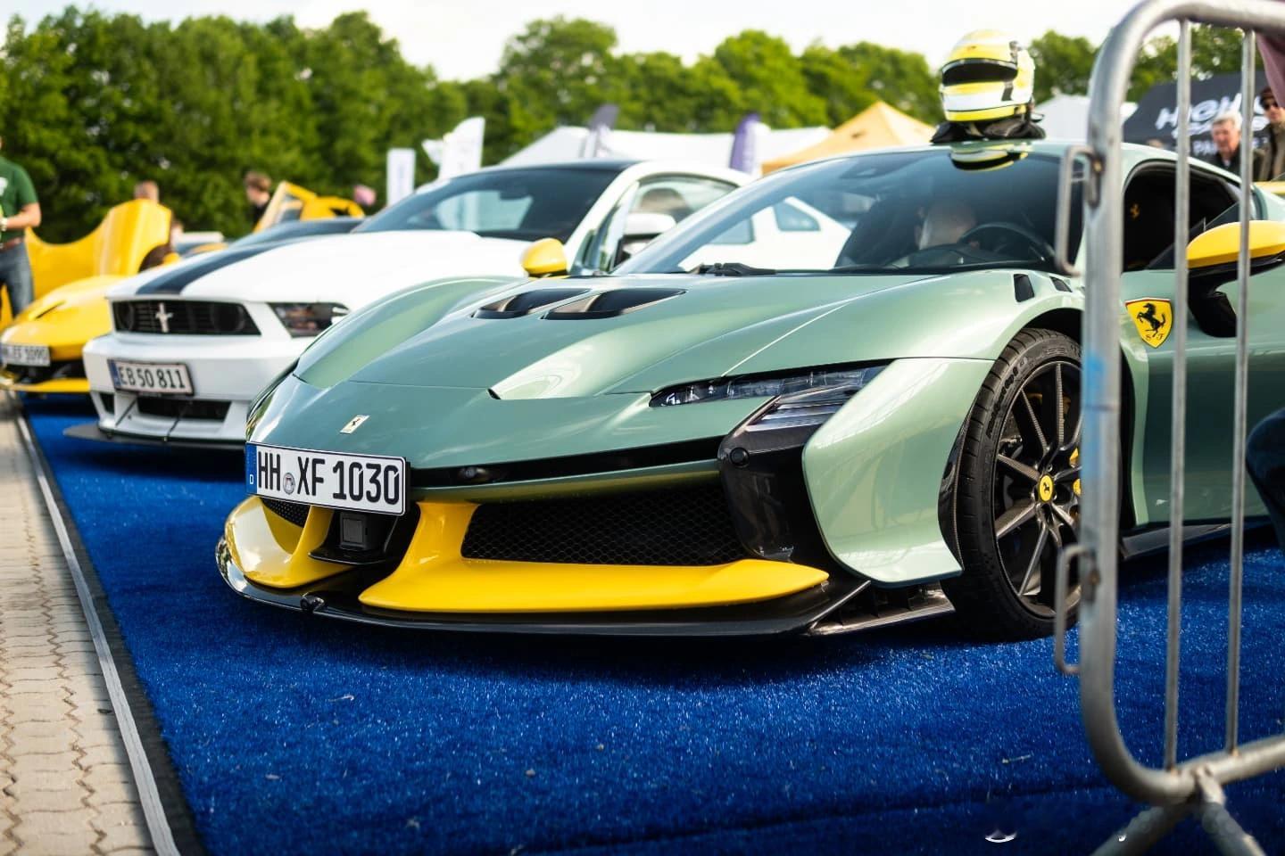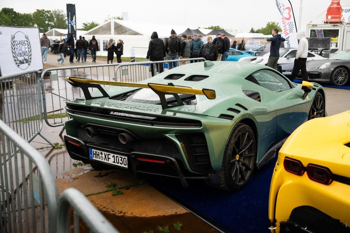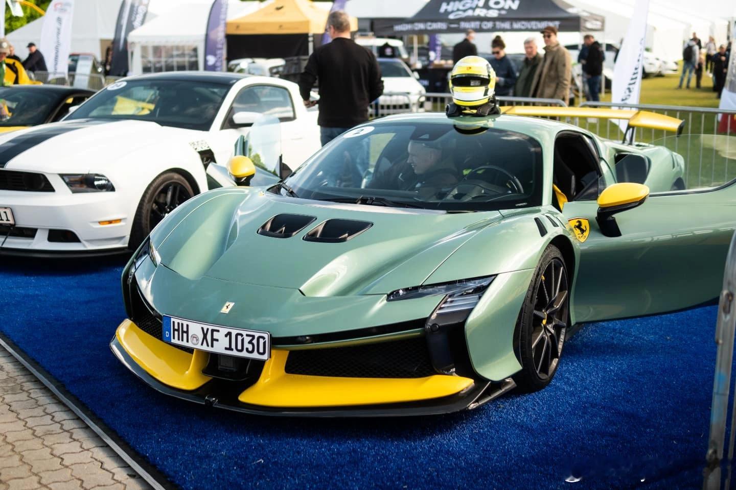 外观配色为Verde Francesca,这是一款来自一台488 Pista的车主定制色,因为其好看的翡翠绿色而流行。外观方面前扰流板,反光镜和尾翼使用了黄色,此外还选择了碳纤维轮毂和漆盾。交付地于位于德国卡塞尔的Eberlein Automobile GmbH,这台SF90 XX虽然注册在了德国,但却出现在一场位于丹麦的车聚中。图片来自.patri