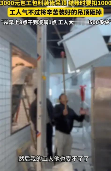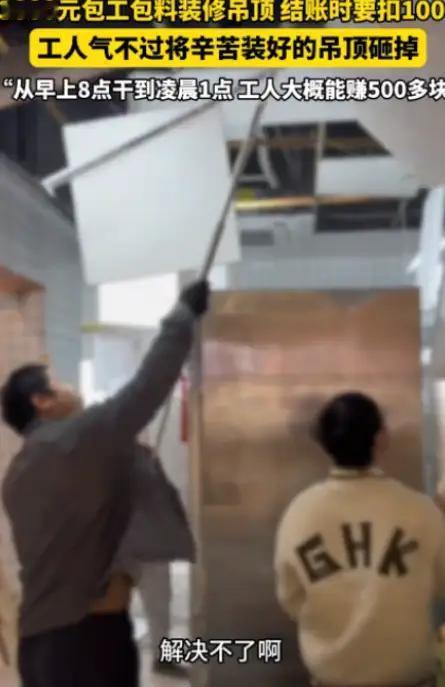 损人不利己!”近日,湖北武汉,一老板找人做吊顶,谈好了3000元包工包料,工人从早上8点一直忙到凌晨1点才做完,可结账时,老板鸡蛋里挑骨头,这里不严那里不好看,坚决要扣1000元,工人气不过,将装好的吊顶全拆了。 十七小时的汗水,被一句轻飘飘的“不满意”压价千元。他拆的不是吊顶,而是钉在人心上那枚名为“好欺负”的钉子。 本来可以提前开业,因为你的自私贪心而无法正常开业。这样的老板饭店开出来生意也好不到哪里,人品决定一切。 这种无德老板,小人之心,发不了大财,就是之后花钱重装,不改变心态做事做人,那日后生意也不会好那去!支持装修工人!