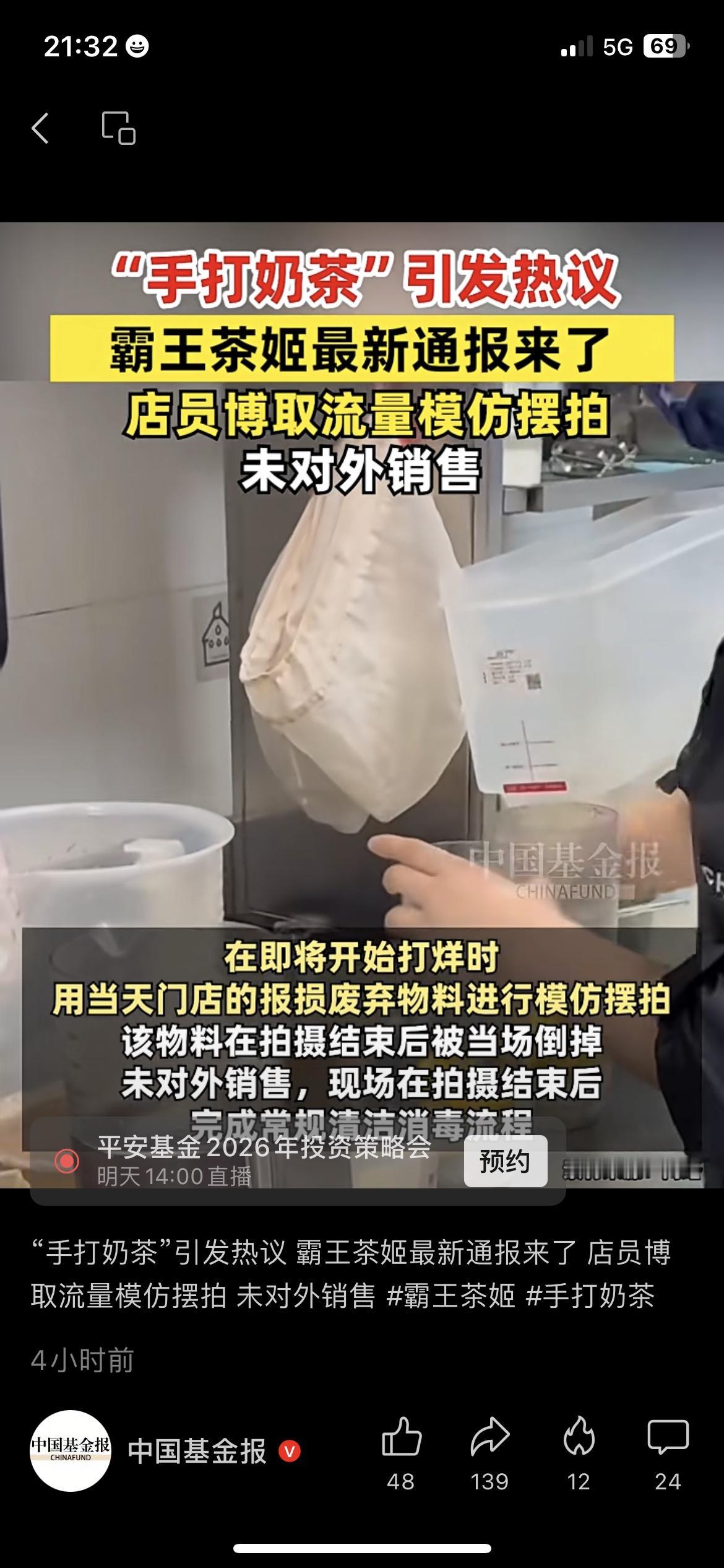 霸王茶姬手打奶茶竟是摆拍!用报废物料博流量,处理结果来了 真的离谱!中国基金报刚曝光,霸王茶姬的“手打奶茶”居然是店员摆拍的!福建漳州龙文宝龙广场店的店员,没戴手套,徒手砸冰、捏柠檬、搅拌奶茶,为了跟风“印度奶茶”热梗博流量,用店里的报废物料假装做手打奶茶,拍完还直接倒掉了,根本没对外销售。 霸王茶姬的处理速度倒是挺快,涉事门店无限期停业整顿,店员直接辞退,店长和区域督导也被降职了。说实话,我平时还挺爱喝霸王茶姬的,看到这事儿挺失望的。 虽然没对外销售,没危害到消费者健康,但这种为了流量弄虚作假的行为,真的砸品牌口碑。餐饮行业靠的就是诚信,耍小聪明博眼球,迟早要栽跟头。 你们怎么看这种餐饮摆拍博流量的行为?还会喝霸王茶姬吗?评论区聊聊!霸王茶姬奶茶杯 霸王茶姬摆拍 手打奶茶