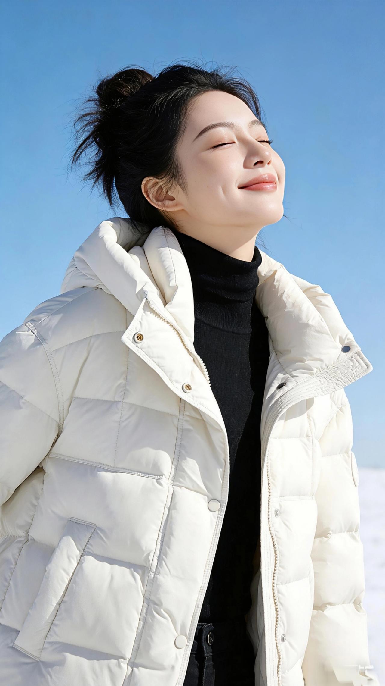 雪野间的暖漾 冬日的雪原被揉碎的阳光铺成绵软的绒毯,澄澈的蓝天像一块刚被擦拭过的琉璃,悬在头顶没有一丝杂色。她站在这片白茫里,乌发挽成俏皮的丸子头,几缕碎发被清冽的风拂得轻轻晃悠,像枝头雀跃的细雪。 米白色的羽绒服裹着一身温柔,蓬松的菱格纹路将寒意隔绝在外,领口处露出的黑色高领打底,像是在奶白的画布上添了一笔利落的墨色。她仰起脸时,唇角的笑意撞碎了阳光,在雪地上漾开细碎的光斑;抬手拢了拢羽绒服的帽沿,指尖触到软糯的面料,暖意便从指尖漫到心底。 风掠过雪地时带起微凉的雪气,却吹不散她周身的温煦。她将手插进口袋,身体微微舒展,或是轻轻扬起手臂,像拥住了整个冬日的晴朗。这件暖白的羽绒服,是她与寒冬对话的温柔底气,让这片雪野里的清冷,都化作了绕身的甜暖,而她站在其中,是冬日里最鲜活的一抹温柔。 高级感穿搭 冬季穿搭 棉衣棉服 羽绒服