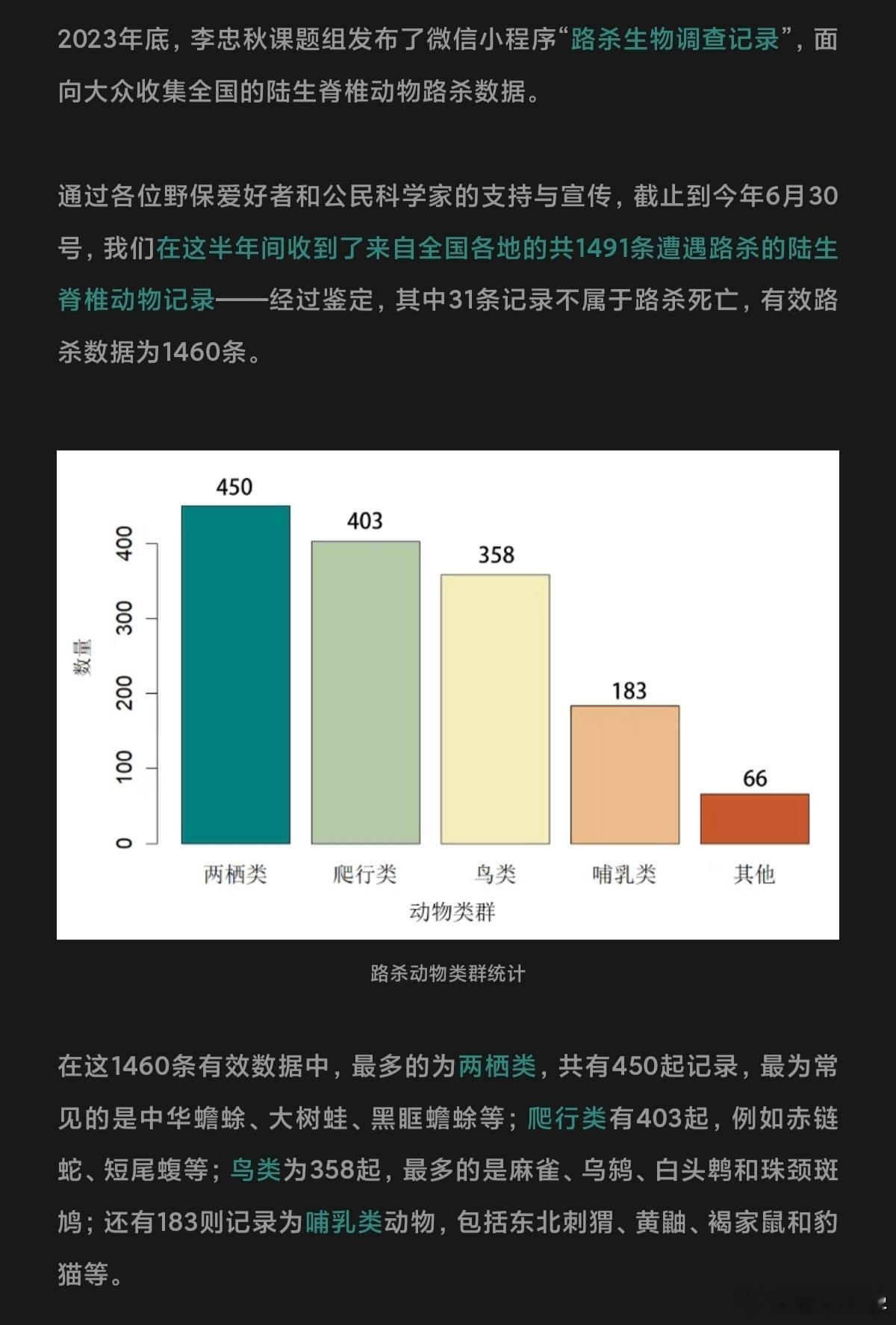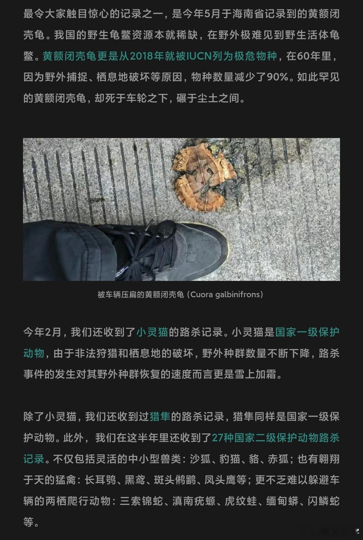 路杀,是指野生动物被车辆撞击或碾压而死。在全球这是导致动物直接死亡的主因之一。目前在我国数据还显空白,但南京大学“动物行为与保护实验室”发起 【路杀生物调查记录】小程序。路上见到被撞动物(确保安全),可以拍张照。搜索小程序“路杀生物调查记录”。上传照片、地点与时间。上传的每条数据,都可以帮助科学家:锁定“路杀黑点”路段推动建设动物天桥、地下通道最终让道路对野生动物更安全公民科学家随手拍救野生动物小众公益