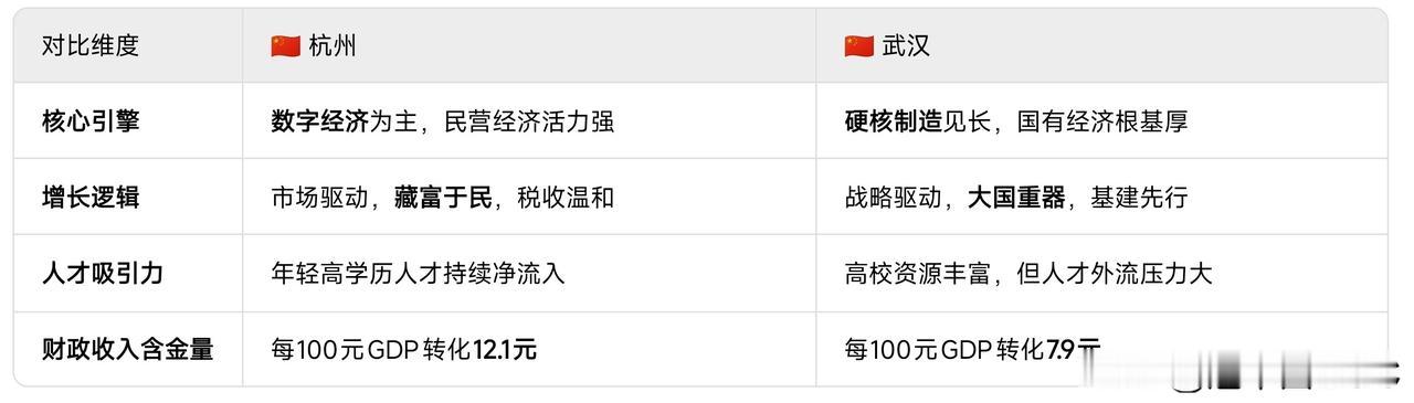 杭州和武汉这种你追我赶的态势,背后是两种模式的互补与竞争。 杭州的“民富”路径:得益于阿里巴巴等平台企业带来的财富倍增效应和更为规范的就业环境,杭州在个税收入(武汉的3倍)和居民实际收入上优势明显,形成了“高收入-吸引人才-促进创新”的良性循环。 武汉的“硬核”底气:作为传统工业基地,武汉在光电子信息、汽车制造等领域拥有完整的产业链和国家级实验室体系。其“九省通衢”的区位和强大的基建能力,使其在国内大循环中的枢纽战略地位难以撼动。 🔭 未来展望 未来的竞争关键,在于谁能更好地弥补短板: 杭州需要思考如何让数字经济更好地赋能实体制造业,突破土地资源等限制。 武汉的挑战则在于如何将国家布局的战略优势,转化为本地民营经济的活力和居民的实际收入。 未来你更看好哪所城市呢?