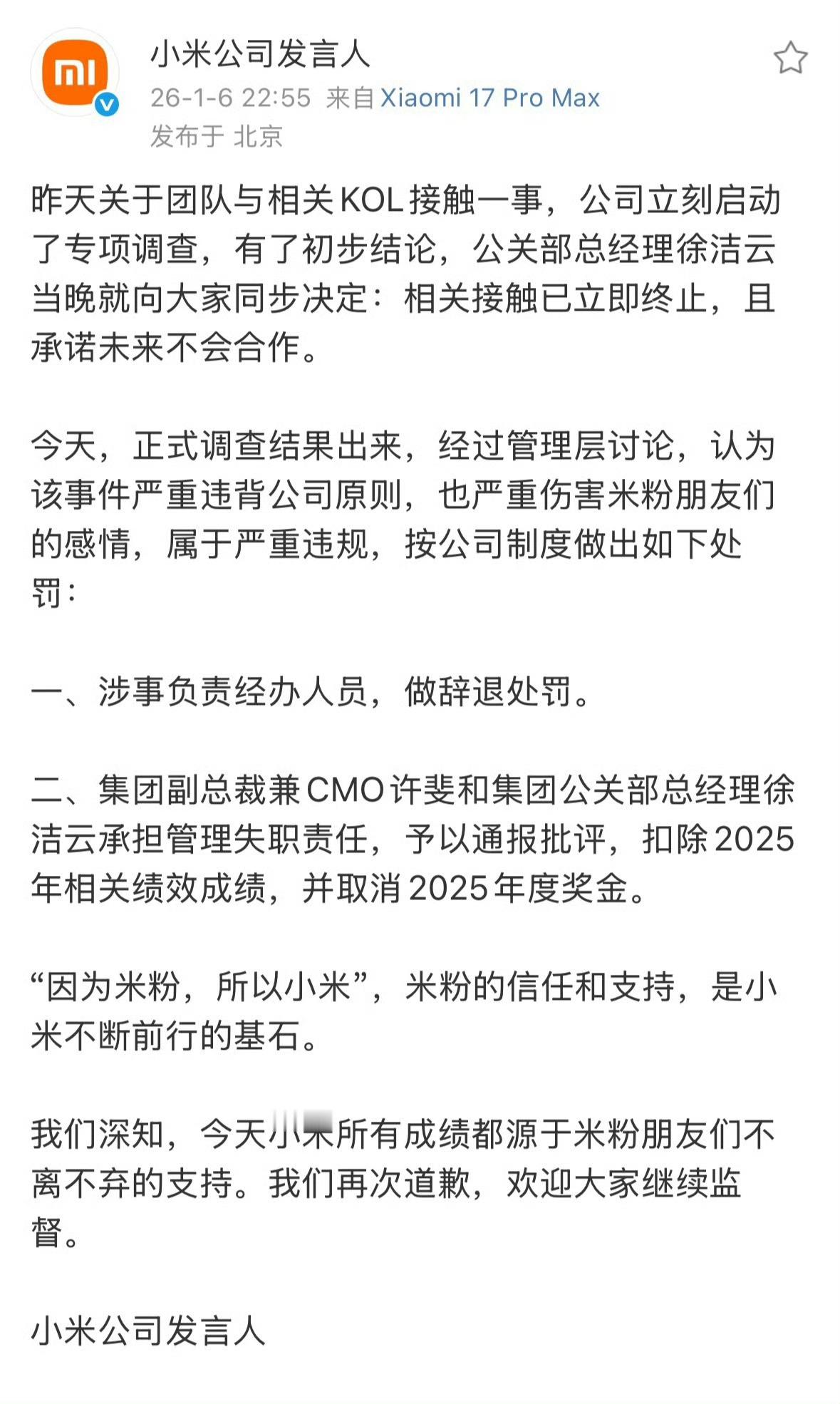 因为米粉,所以小米。日前,小米公关团队因接触相关KOL,导致米粉感情被伤害,小米方面的回应很迅速,从经办人到相关高管,从辞退到通报批评。如此至上而下、一罚到底的处罚,米粉应该满意了,只是感觉处罚有些重了,真不至于。此前,有人分析称,小米这波操作属于饭圈常见的“虐粉”,我是一直不相信的,如今小米公关高管都“被冲”了,这明明是“宠粉”。