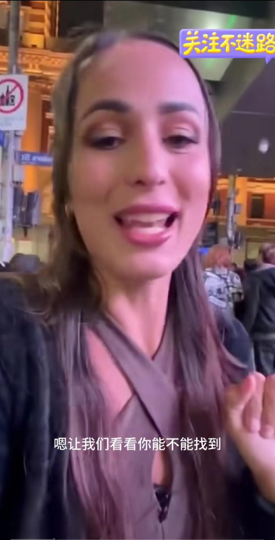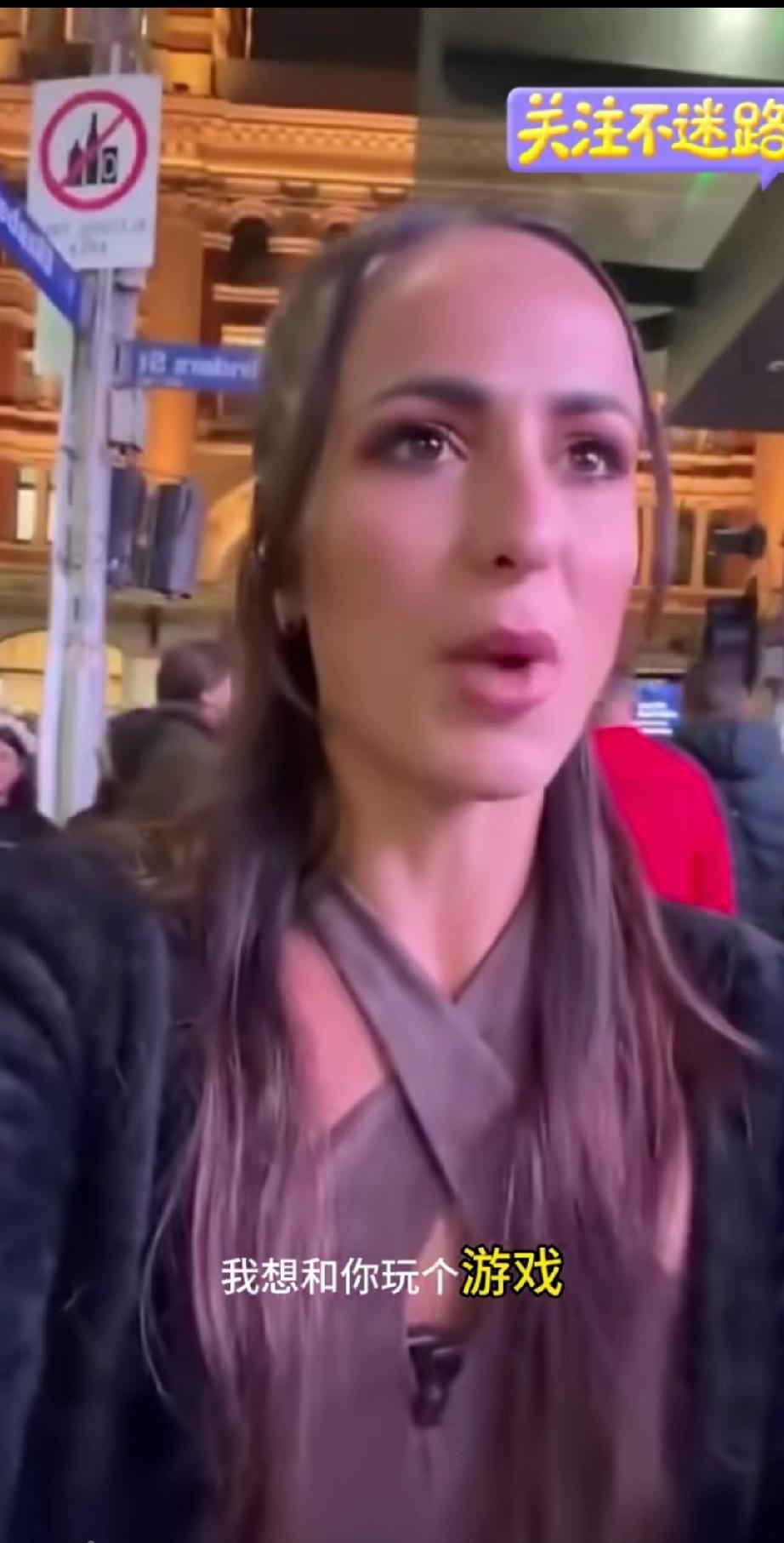 澳大利亚悉尼街头,一位白人女博主说要和镜头前的粉丝做个游戏,于是就出现了下面让人