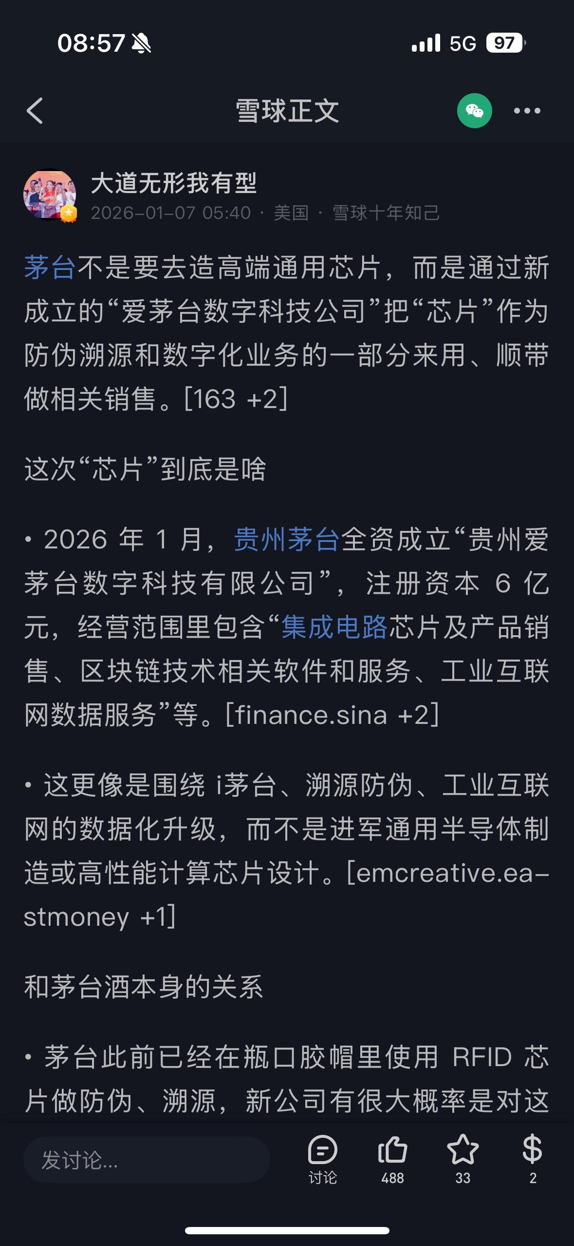 大道段永平谈茅台 认为茅台搞芯片的目的是防伪体系的延伸。按照他的思考框架 ,属于在正确的做事 方法,推进和围绕着给消费者真酒好酒这个做正确的事。