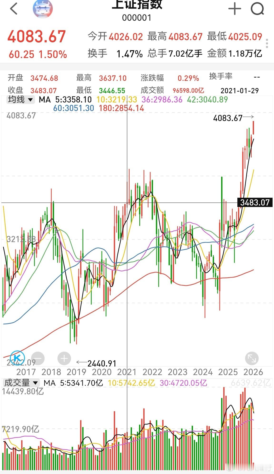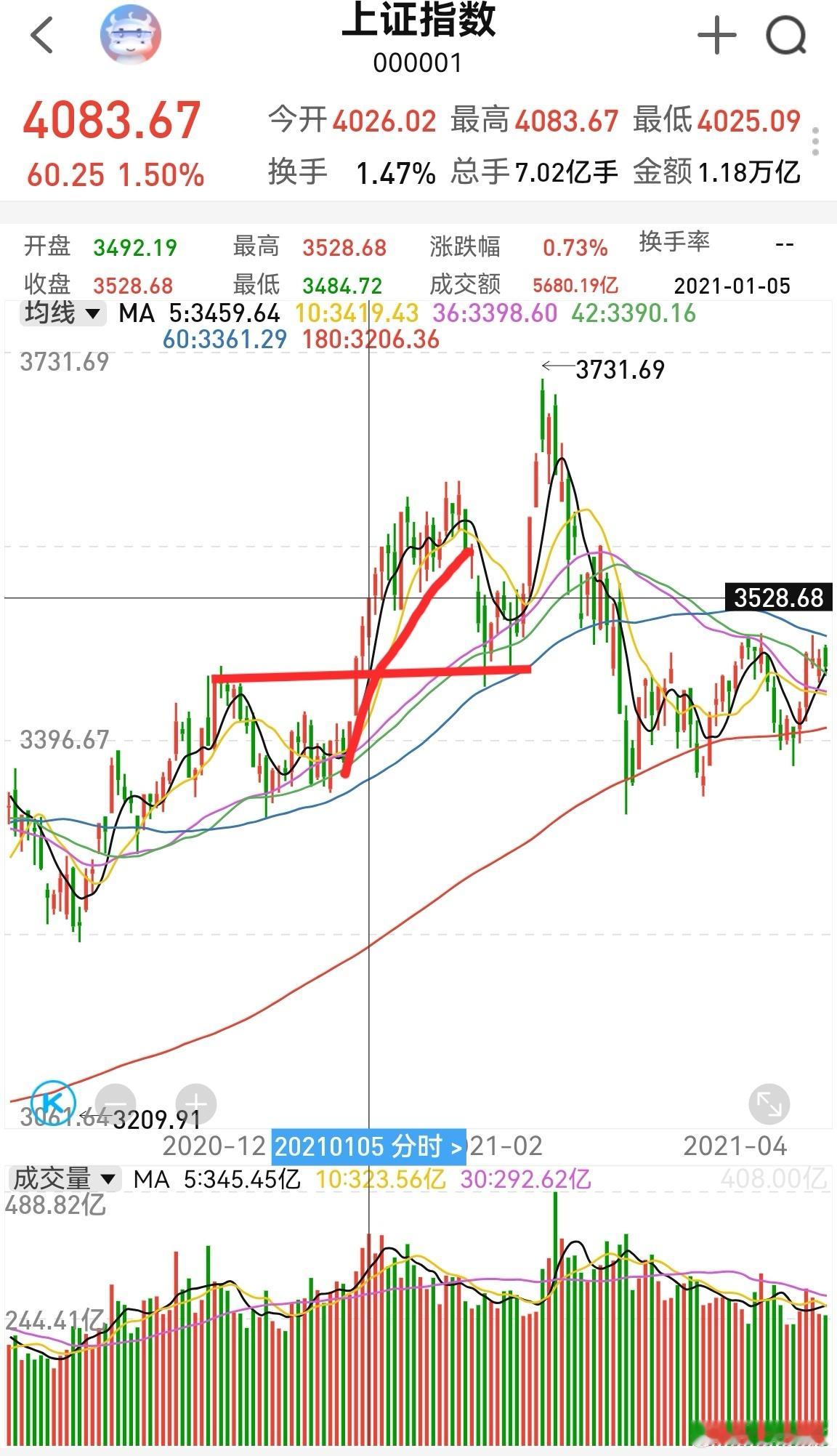 极致的十三连阳,让很多人热血沸腾。从月线看,现在的走势不大好。酝酿不足就突进,容易形成力竭。这一点2021年一月份的月线走势可以参考。而且这种局势下,今年一整年的走势会是一个震荡走势。从月线看,4166是大压力。重点看后面1—3天,哪天放量3w亿以上,且收小阳或者阴线,放量滞涨,那时就是顶。