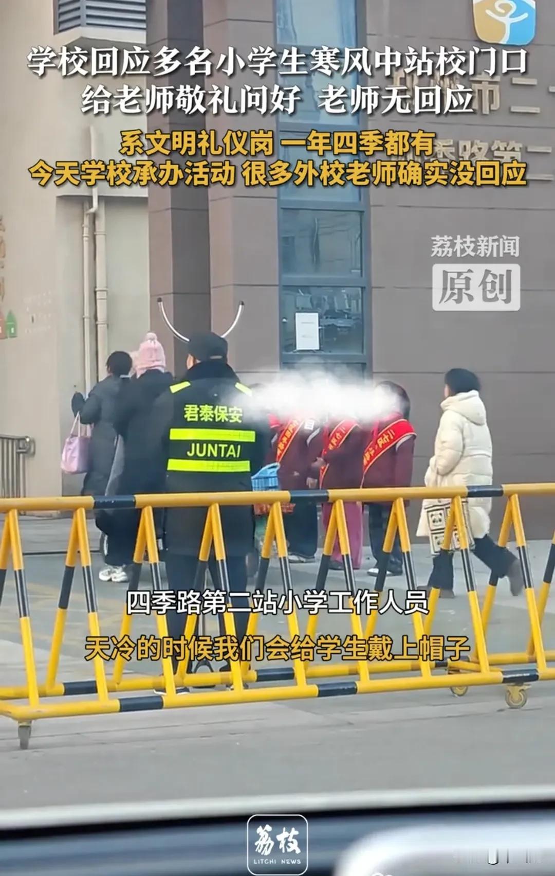小学生身披绶带,冒着凛冽的寒风,站在学校大门前,向走进学校的老师敬礼,并齐声高喊