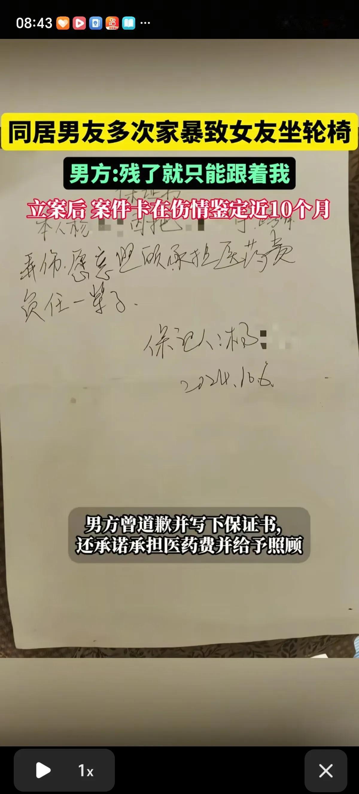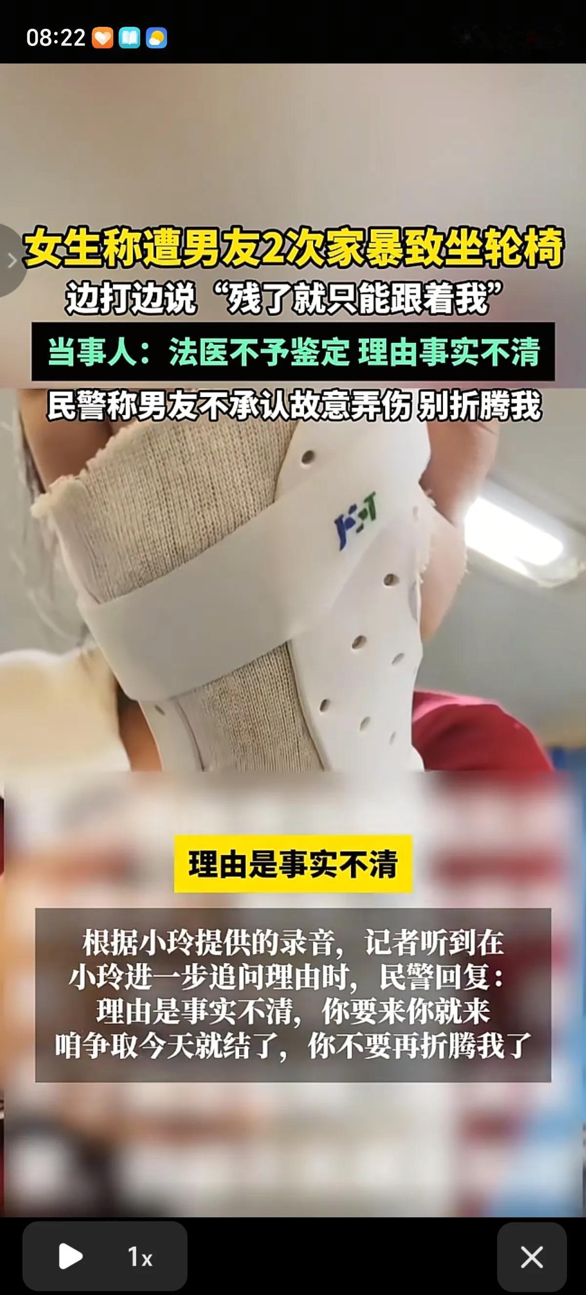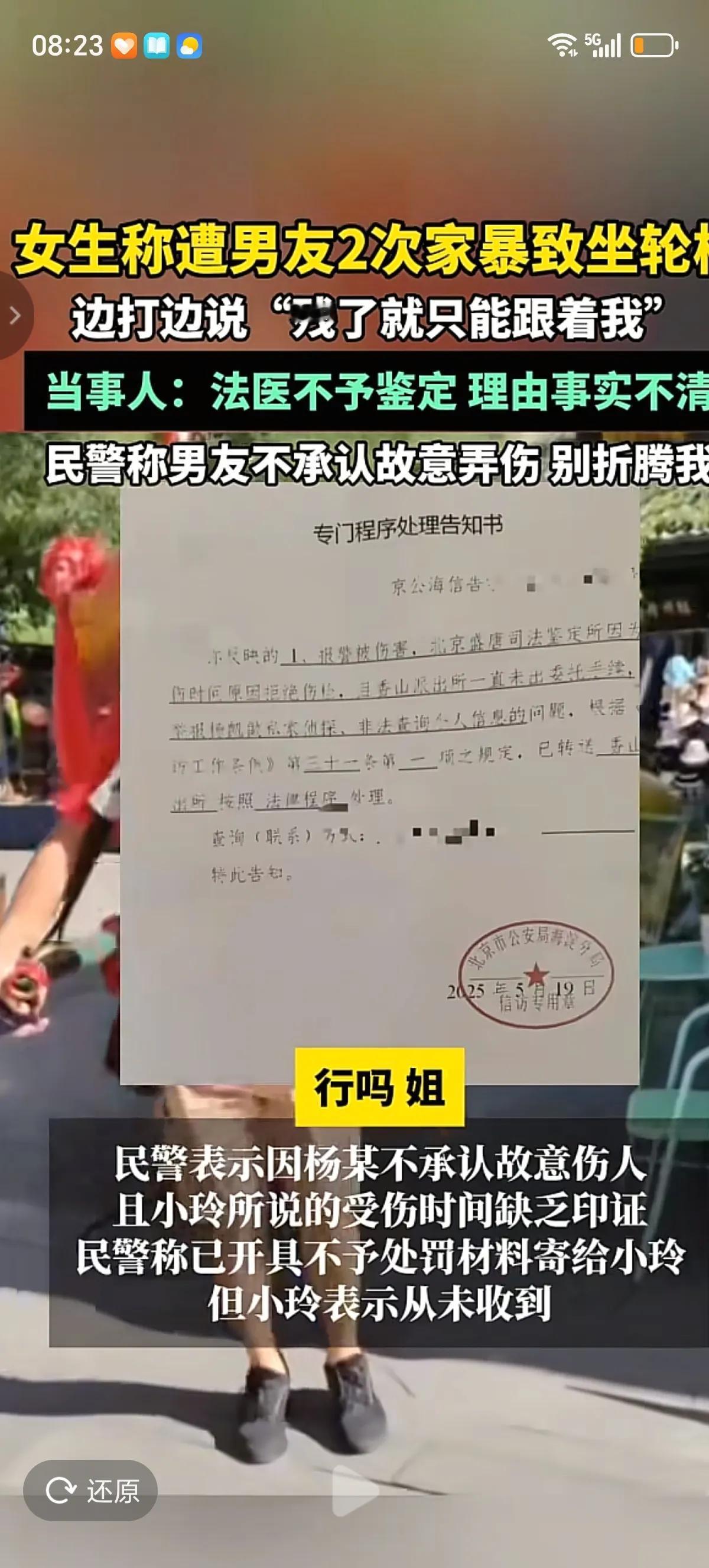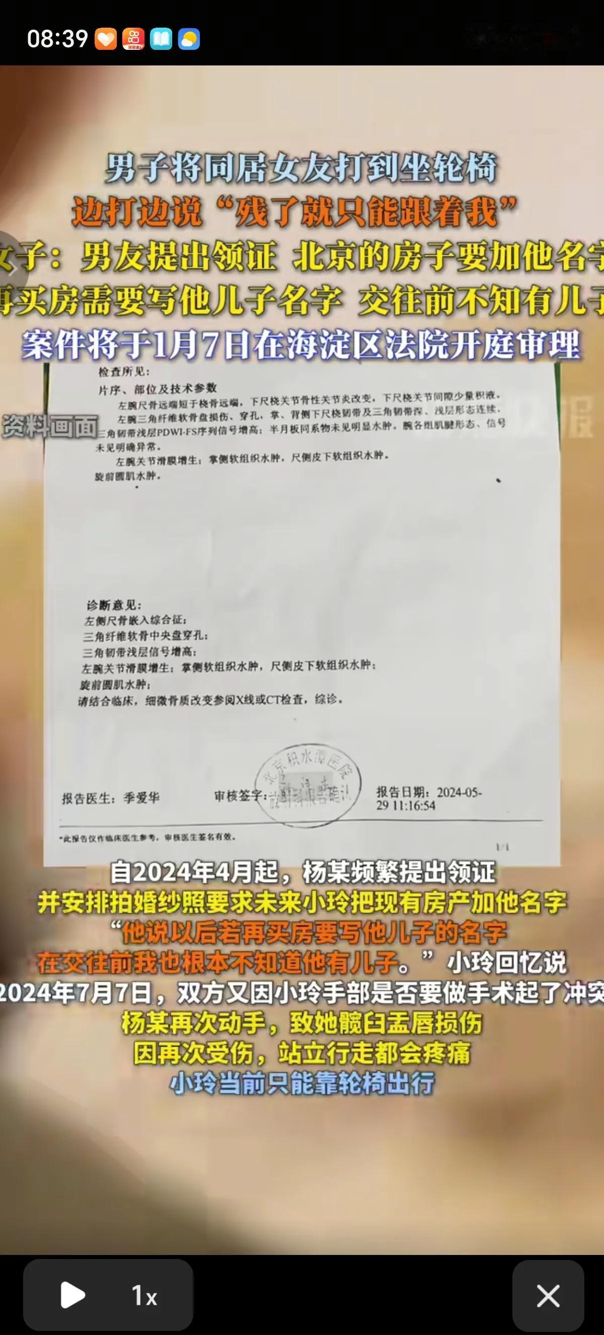 爱你爱到让你坐轮椅!男友一句“残了就只能跟着我”,言出必行,先是打残了女友双手,取得原谅后,再是打的女友站不起来 真就只能坐轮椅了,女友想问男子有没有真的爱过她,男子沉默没有回答。 北京女孩小玲是家中独生女,家境富裕,在海淀有两套价值千万的房产,在一次朋友聚会上认识了男友杨某,二人很快确立了恋爱关系,两个月后同居。 小玲不知道的是,在男友认识她的时候还是已婚状态,并且有一个儿子,还有案底,比如盗窃、卖信息之类的。 在俩人同居后,男友频繁要求早点领证结婚,照了婚纱照后就要求女友赶紧把自己在北京的房子上加上他的名字。双方在一次口角中,男友打了小玲,让女友双手受伤,生活不能自理。再通过道歉、写保证书,承诺要跟小玲过一辈子,一生一世在一起这样的方法取得了女友的原谅。 之后的男友杨某就不加掩饰了,不但要求尽快领证,要求女友房子加上他的名字,还要求女友房子加上他儿子的名字。女友渐渐意识到了不对,男友之前从来没说过他有儿子。 之后女子因为手部旧伤想去医院治疗,想做手术让自己的双手恢复正常,男友不但阻止她做手术,还又打了她,别打边说“打残了就只能跟着我”,说女友只能跟着他,没有别人会要她了。让女友知道除了自己,她找不到更好的了。 这第二次把女友打的髋臼盂唇损伤,真的坐上了轮椅,直到现在也没有站起来,只能靠着自己的妈妈照顾自己的日常生活。 俩人因为同居关系,这种行为被认定为家暴,而且男友一直跟调查的人说他俩会和好的,伤情鉴定拖延了10个月。男友也不承认自己是故意弄伤女友的,还要求赶紧结婚,让女友别再折腾他了。 后来小玲在亲戚的帮助下发现男友还从她的银行卡里给前妻转过5万块钱。觉得自己受到了欺骗,男友一直在欺骗自己的感情,试图PUA她,还想骗走自己的房子,决心给自己讨一个公道,让男友承担自己治病的费用。她想尽快摆脱男友,恢复健康的身体。