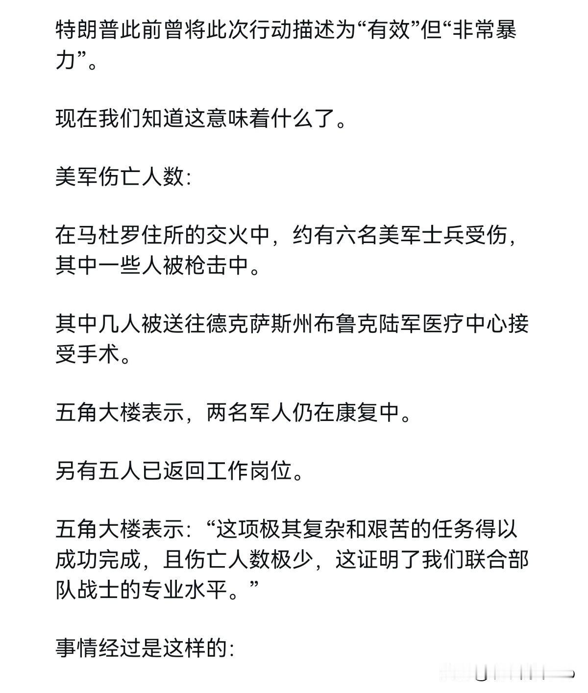 美军并非没有伤亡!特朗普夸大了美军战绩,更详细的情况曝光了!1月7日,根据外媒报道,据知情官员透露,美国政府目前估计,在周六针对抓捕马杜罗开展的军事行动中,约有75人丧生。而美军也绝非是零伤亡,知情人士透露,交火过程中,约6名美军士兵受伤,部分人员在马杜罗官邸的枪战中遭受枪伤。 其中数人被送往得克萨斯州布鲁克陆军医疗中心接受手术治疗。五角大楼表示,仍有2名现役军人在康复中,另有5人已归队执行任务。五角大楼称:“此次任务极为复杂艰巨,却能在实现圆满完成目标的同时,将己方伤亡控制在如此低的水平,这充分彰显了我们联合部队官兵的过硬专业素养。不过,美国方面表示,此次行动,美军的实力仍旧是压倒性的。 很显然,从最新披露的消息来看,美国抓捕马杜罗的行动,绝非美国方面报道的是零伤亡,美国方面最初为了彰显美军的“神兵天降”,明显是夸大了美军的战绩。而那些为了保护马杜罗而战死的32名古巴卫兵,完全值得尊重。事实上,他们的战死恰恰说明,他们面对美军特种部队,无所畏惧,给予了美军杀伤。而这几乎是整个委内瑞拉国内,唯一的像样的对美军的抵抗行动。 当然,如果事后复盘,如果古巴卫兵配备重武器,恐怕美军特种部队遭受到伤亡会更加的巨大。当时,要不是美军动用直升机,利用机载火力进行压制,美军能不能得手,恐怕都并不一定。很显然,随着更多的信息曝光,那些被美国视为眼中钉的国家,恐怕也会仔细研究美军的战术,找到反制美军特种作战的方法。如果有下一次,美军怕是没有那么轻松了。
