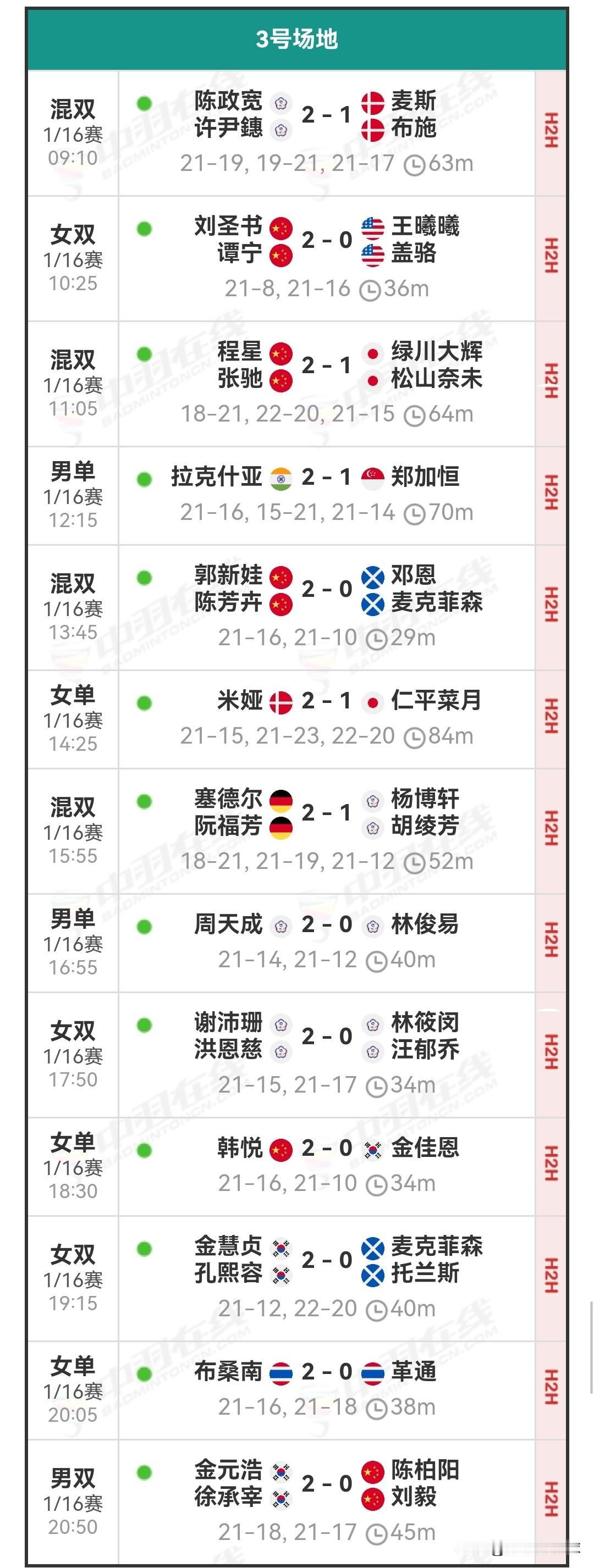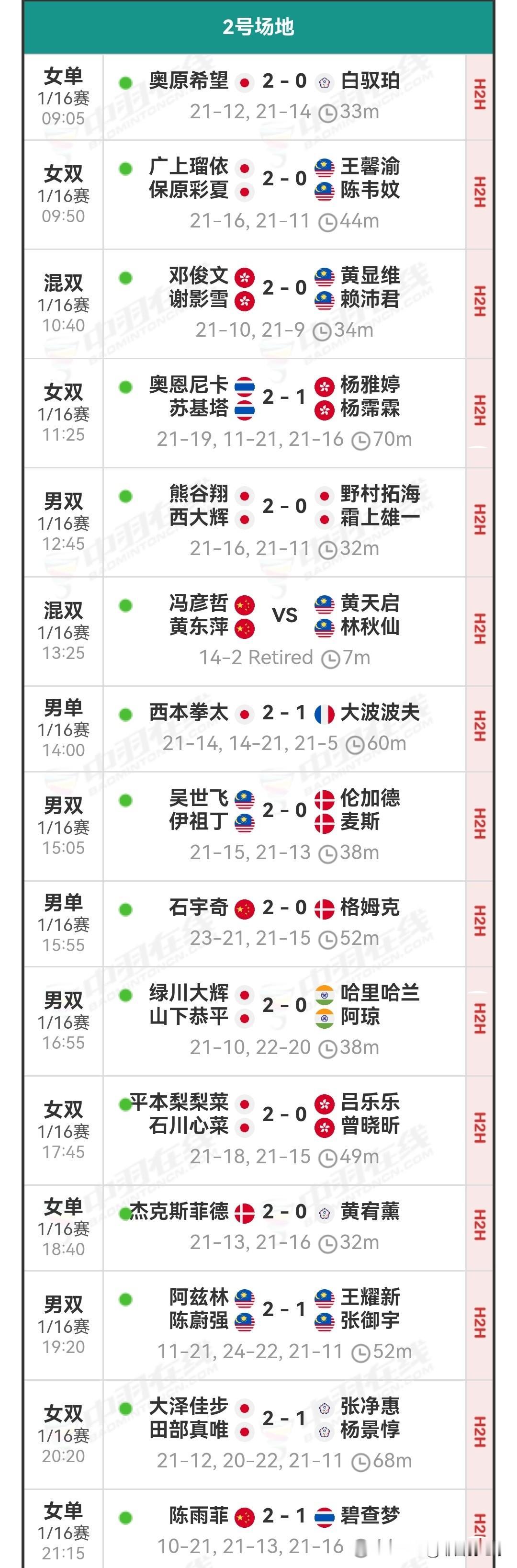 1月6日马来西亚羽毛球公开赛首日战报 昨天国羽7胜2负,石宇奇,陈雨菲,凤凰组合,圣谭组合,星驰组合,等均晋级下一轮,梁王组合,100分组合,均一轮游,男双损失过半,此站复出的辣子鸡也搞了一轮游,详细战报如下: 国羽赛程 羽毛球 羽毛球爱好者 羽毛球比赛 羽毛球公开赛 石宇奇 陈雨菲