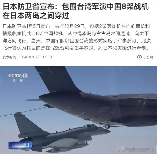 日本时隔这么多天才出来吭声!要不是日本防卫省自己说出来,我们都不知道围台军演时,我们轰炸机挂弹对日本进行了震慑! 1月6日,根据法新社报道,法媒表示,日本防卫省披露了有关我们对台军演的信息。日本防卫省表示,去年12月29日,包括2架轰炸机在内的军机和情报收集机共计8架中国战机,从冲绳本岛与宫古岛之间通过,向太平洋方向飞行。 根据披露显示:这些战机包括2架轰-6轰炸机、2架歼-16战斗机、2架运-9情报收集机等共计8架战机,从东海经由冲绳本岛和宫古岛之间的宫古海峡飞往太平洋,随后又原路返回,同时还有3艘中国海军护卫舰通过了同一海域。 这套动作,其实是解放军近年来常态化训练的一部分,目的就是锤炼远海远域作战能力。宫古海峡是国际水道,中国军机舰艇在此通行完全符合国际法和国际实践,是合理合法的。但关键在于,这次飞行和航行的时机非常巧妙,它与台海方向的“正义使命-2025”演习形成了紧密的配合。 当台海方向战鼓擂响,解放军陆、海、空、火箭军多个力量在台岛周边摆开阵势,最近处逼得那么近,这本身就形成了强大的正面压力。而与此同时,轰炸机编队奉命赶赴台岛以东海域,重点演练远程奔袭、联合精打。 台岛以东是什么地方?那可是外部势力航母等大型舰只传统上认为的“安全区”,也是某些人幻想着万一有事可以逃窜或者等待外部援助的方向。 解放军轰炸机往那个方向一去,挂载着实弹演练对海突击,就等于明确告诉外界,这条“后路”和“援路”已经被盯上了,所谓的“安全区”不再安全。这正是一种“外线立体慑阻”的思路,把战场主动权牢牢抓在自己手里。 日本防卫省事隔多日才披露相关信息,这种“延迟”本身就透露出不少信息。它可能是在内部紧急评估局势,可能是在与盟友协调对策,也可能是因为解放军行动的综合性和威慑力超出了其常规预判,需要时间来分析消化。法新社等外媒的报道,某种程度上也是帮我们确认了解放军此次行动的力度和广度,以及其产生的实际威慑效果。 这次演习和相关的飞行、航行活动,清晰地展示了解放军维护国家主权和领土完整的强大能力和坚定决心。这种能力是实实在在练出来的,不是喊出来的。对于解放军在台海和周边海空域的合法合规行动,有关方面其实应该早点习惯。总是这样“大惊小怪”或者“延迟反应”,反而显得自己心里有鬼或者准备不足。 总之,日本防卫省的这个“马后炮”式的披露,恰恰从侧面印证了解放军近期行动的突然性、综合性和有效性。它告诉我们,在维护国家核心利益的问题上,中国军队有足够的智慧、能力和手段来应对任何挑战,并且能够通过创新的战术战法和战略布局,让潜在的干预势力不得不三思而后行。未来的台海乃至更广阔的西太平洋地区,这样的态势很可能还会继续深化发展。