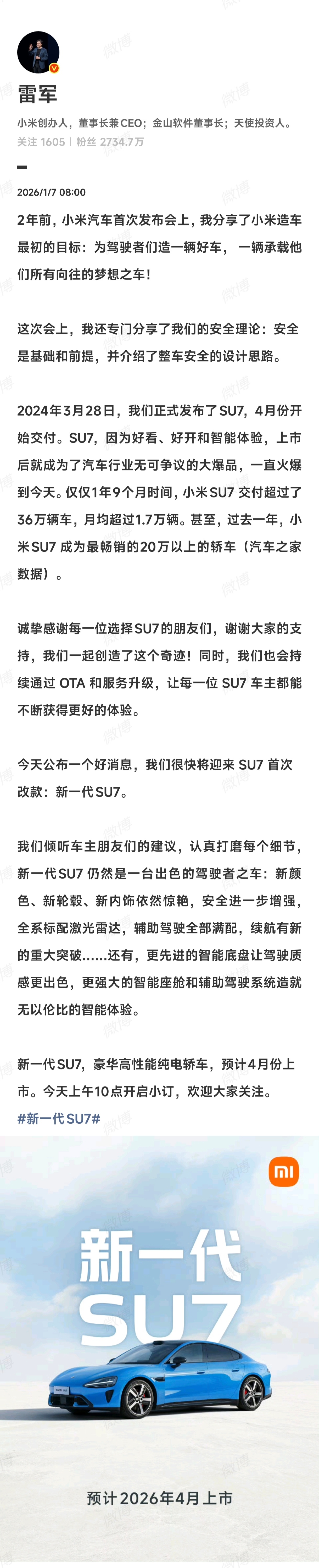 雷军官宣新一代SU7 六边形战士又进化了,小米SU7改款正式宣布,说真的,这次升级还是一如既往实在。我看了一下APP里面也上架了,今天就可以开始小定,按照之前的交付情况,我觉得只要有想法的都赶紧先下定,免得到时候又等半年才提车……要知道SU7上市22个月,销量依旧稳健,市场已经验证了它的产品力。现在能看到的就是外观做到了延续经典,这个卡布里蓝也有点意思,估计又是爆款。虽然配置目前还没有公布,但雷总说了:新颜色、新轮毂、新内饰,安全增强,全系标配激光雷达,辅助驾驶全部满配,续航有新的重大突破……本来就很好的底盘还要升级。我感觉涨价是没跑了,里外都升级了一遍,涨点能接受,我现在纠结才开一万公里的YU7要不要置换?