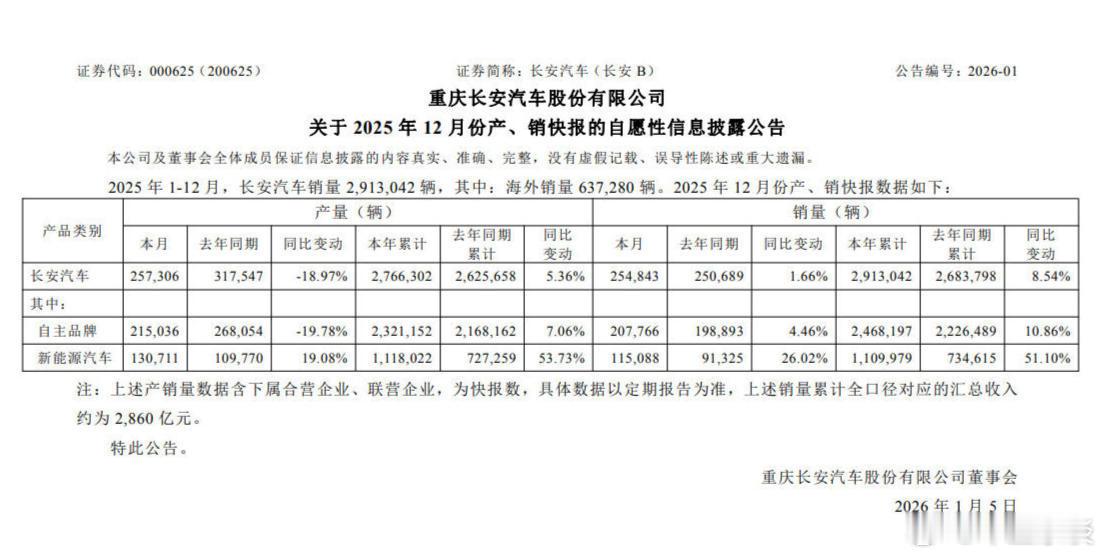 长安汽车回应取消年终奖为不实信息 在各路媒体渠道以及脉脉上流传几日后,关于取消年终奖一事,长安汽车今天给出了回应,称不实。长安汽车称:2025年,长安汽车整体经营态势稳健,公司已根据年度经营实绩,按照激励标准制定并推进相应激励计划,切实保障员工权益,助力企业可持续发展。这意味着,关于激励,长安汽车应有。在过去的2025年,长安汽车全年销量超290万辆,同比增长8.54%。其中,自主业务全年销量占公司比重高达84.7%,高于去年1.7个百分点。新能源车销量超过110万辆,同比增长51.1%,占比为38.1%,高于去年10.4个百分点。全年出口量近64万辆,同比增长18.8%。大V聊车车圈财报