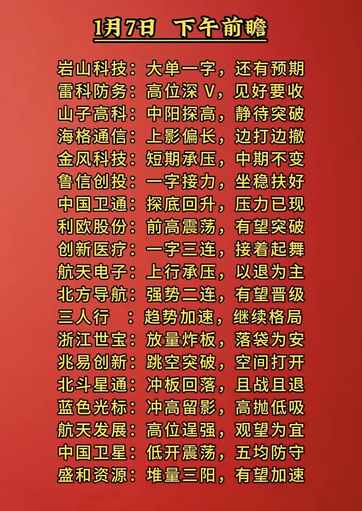 1月7日下午前瞻:科技股强势,静待突破! "岩山科技强势封板,雷科防务高位震荡需谨慎,创新医疗三连板行情延续,北方导航二连阳有望冲高,浙江世宝放量宜止盈,市场分化中把握强者恒强