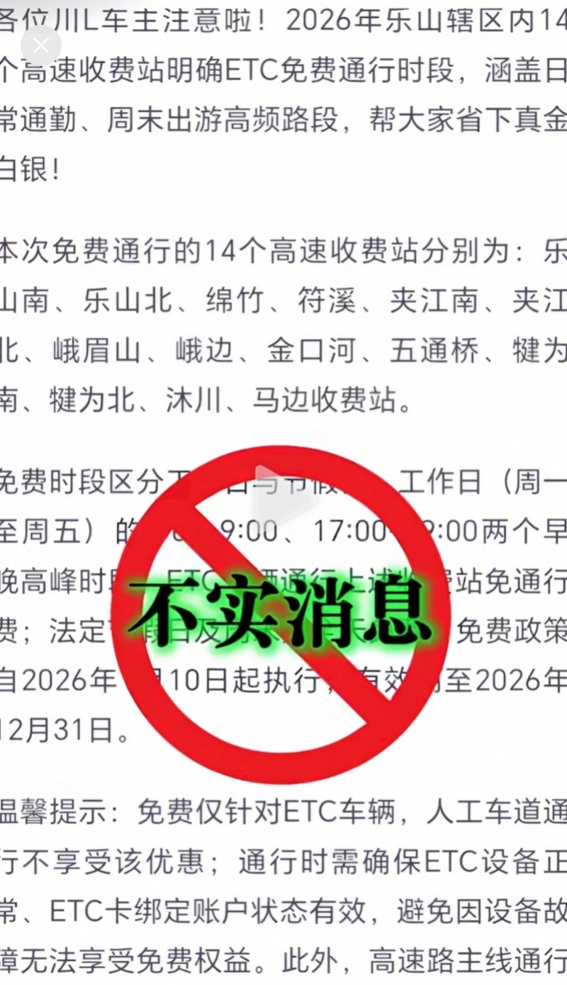 #乐山辟谣ETC节假日周末免费#【乐山辟谣“高速ETC节假日周末全天免费”!限本地车限时段】#乐山本地车辆ETC早晚高峰免费#近日,有网友发布消息称,“四川乐山高速收费站ETC将于2026年1月10日起实行特定时段免费通行,法定节假日及周末全天免费”,引发关注。1月7日,南都N视频记者从乐山市交通运输局获悉,该消息不实,目前周边14个收费站对乐山本地且已安装ETC套装的小客车实施早晚高峰限时免费通行。此前曝光于网络的消息显示,“本次免费通行的14个高速收费站分别为,乐山南、乐山北、绵竹、符溪、夹江南、夹江北、峨眉山、峨边、金口河、五通桥、犍为南、犍为北、沐川、马边收费站。免费时段区分工作日与节假日,工作日(周一至周五)的7时-9时、17时-19时两个早晚高峰时段,ETC车辆通行上述收费站免通行费;法定节假日及周末则全天免费,免费政策自2026年1月10日起执行,有效期至2026年12月31日。”1月6日,乐山市交通运输局发布声明称,上述消息不实。2024年12月1日,乐山采取了“政府缴费、车主免费”的政府购买服务方式,启动主城区绕城高速早晚高峰时段免费通行政策,对乐山本地且已安装ETC套装的小客车实施限时免费通行。通行时段为每天早高峰7时30分-9时30分;晚高峰17时30分-19时30分。对于此项免费政策,上述声明指出,限时免费以来,免费通行的收费站点有14个,包括夹江东、乐山、辜李坝、乐山南、乐山港、乐山大佛、全福、通江、符溪、沙湾、苏稽、高新区、罗汉、五通桥收费站。该政策试运行时间为2024年12月1日至2026年11月30日。采写:南都N视频记者 彭雨欣