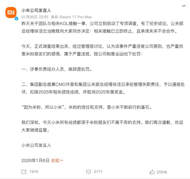 小米徐洁云被通报批评新一代SU7价格今天小米一边是低调发布新车,另一边是高管因违规接触KOL被重罚新车海报说是新一代?明明是改款吧,咋说新一代。结合小米汽车2025年强劲的销售数据和频现的一些等争议,这背后反映的,其实是小米在从“性价比先锋”向“高端化品牌”转型过程中遇到的典型阵痛。关键在于,小米能否平衡好规模扩张与质量口碑。小米正面临 “规模扩张”与“品质管控”、“营销创新”与“合规风险”、“短期业绩”与“长期品牌” 的多重平衡难题。作为新能源汽车新势力,现在小米汽车业务正高速增长,但供应链、品控、售后服务等体系需要时间打磨。此前出现的配置争议,就是体系未能完全跟上规模的体现。雷军个人及团队的强营销能力是巨大优势,但如何管理庞大的营销网络、确保所有触点信息合规,是另一项挑战。本次处罚正是公司试图建立更严格的内部防火墙的信号。公司战略已明确转向高端化,其成功指标不仅是销量,更是用户心智和体验口碑。因此,必须对可能损害品牌长期价值的“捷径”采取零容忍态度。像今天这波操作,可能大家看到的“看不懂”的操作,恰恰是小米在用一场严厉的内部管理,来回应之前外部爆发的产品信任危机。这显示了小米在痛感之下,试图纠正航向的决心。对于关注小米汽车的消费者来说,可以将此次事件视为一个积极的信号,即公司高层似乎有意愿去约束可能损害信息透明度的行为。如果你是一家企业管理者,我倒觉得这是一个经典的案例:当一家依靠流量和性价比起家的公司,决定走向高端和长久时,它必须完成一场从“增长优先”到“质量与声誉优先”的深刻变革。本次处罚的严厉程度,可以看作是这场变革决心的一个试金石。大v聊车老纪侃车